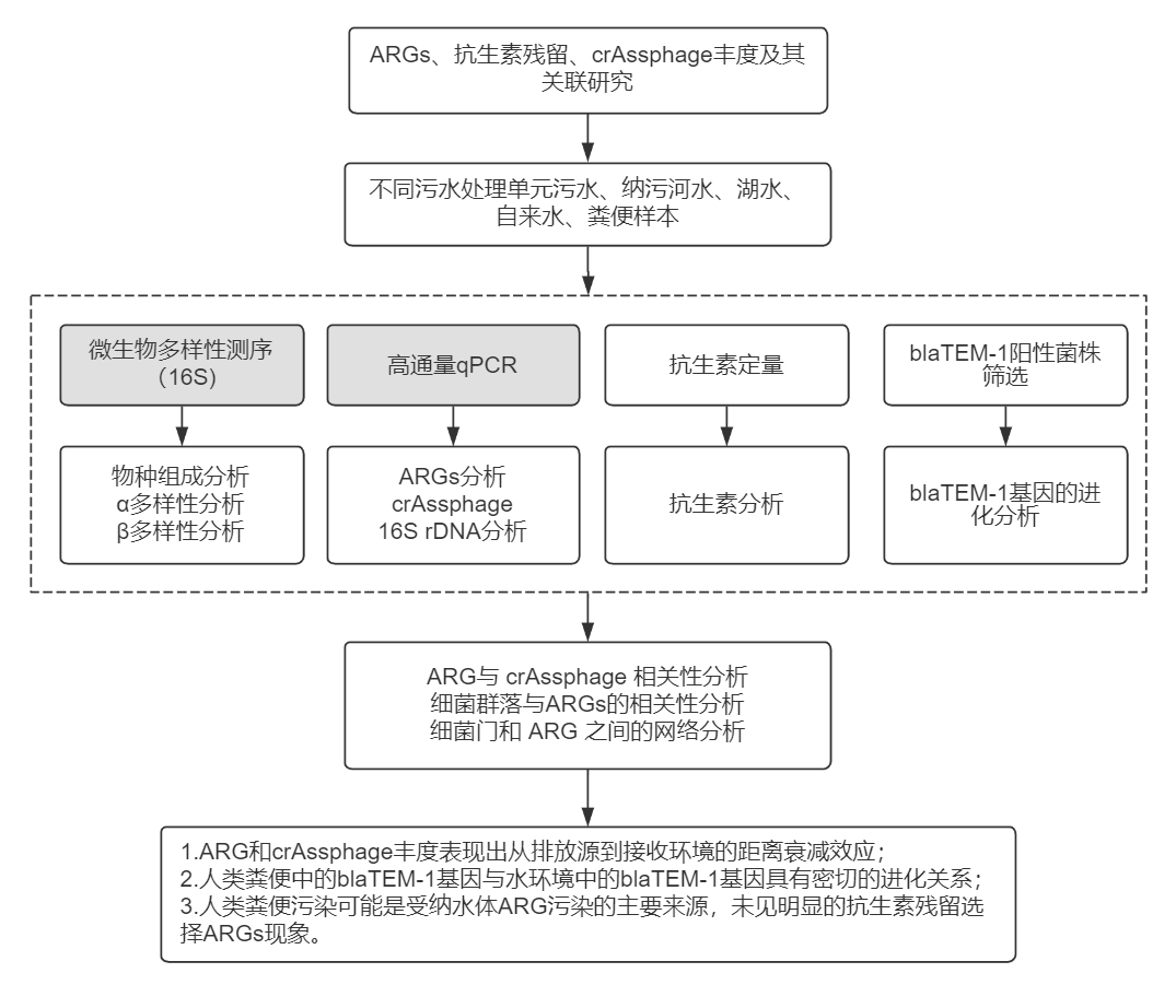 環(huán)境中細(xì)菌的抗生素耐藥性由于與臨床病原體的抗生素耐藥性密切相關(guān)而受到越來越多的關(guān)注。自從人類在臨床上使用抗生素以來,環(huán)境中的抗生素耐藥基因(ARGs)亦有所增加。然而,這種增加是否直接來源于環(huán)境殘留抗生素的選擇性壓力還是來源于人類大量排放的糞便污染卻不得而知。在該項(xiàng)研究中,調(diào)查了人類糞便以及受人類糞便污染影響的不同污水處理廠受納水環(huán)境中的 ARGs、crAssphage 和抗生素殘留特征,以期了解抗生素的選擇壓力和人類糞便污染對(duì)受納水體ARGs污染的影響。
