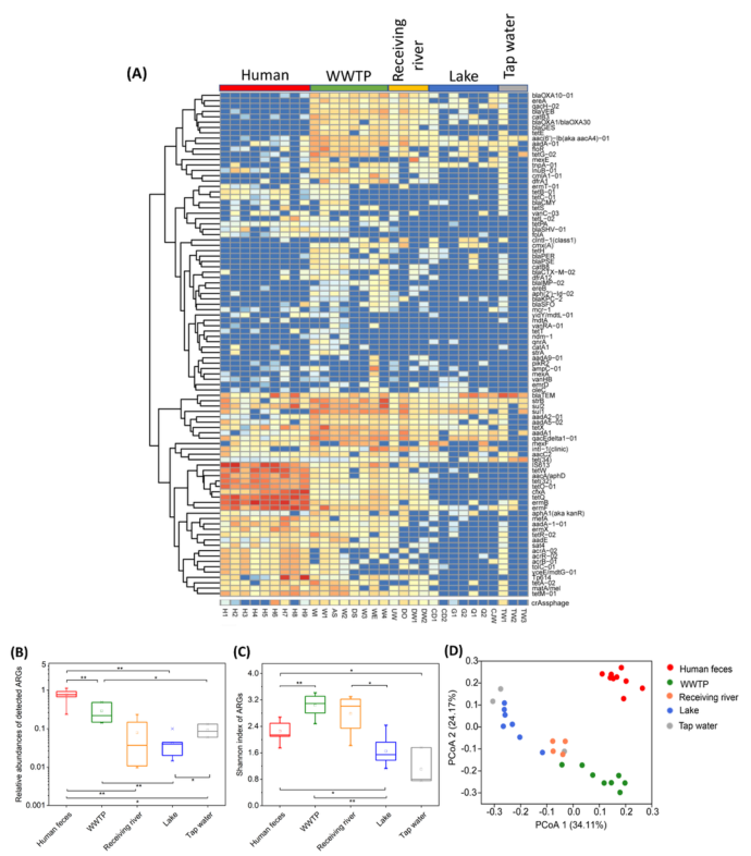 ARG多樣性也隨著水從污水處理廠向自來水的輸送而減少(1C)。所有樣本的ARG譜的PCoA表明,不同類型的樣本包含顯著不同的ARG成分。從環(huán)境樣品中分離出人類糞便中的ARGs(圖1D),表明腸道具有獨(dú)特的ARG圖譜。這可能是因?yàn)榕c環(huán)境相比,腸道的條件不同。來自污水處理廠和受納河水的樣品聚在一起較近,證實(shí)了污水處理廠出水的排放對(duì)受納河中的ARGs有很大影響。同樣,湖泊和自來水更傾向于聚集在一起,與所研究的湖泊都是自來水水源一致。上述結(jié)果表明,在所研究的樣品中普遍存在ARGs,污水處理廠攜帶的ARGs可能污染不同的受納水體。