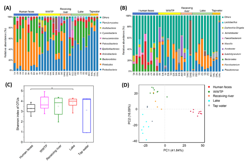 細(xì)菌群落多樣性分析表明,除自來水外,其他水環(huán)境樣品的平均Shannon指數(shù)均高于人類糞便樣品(圖5C)。PCoA分析表明,人類糞便和環(huán)境樣本之間的細(xì)菌群落組成有顯著差異(圖5D)。然而,在人類糞便和水環(huán)境中存在著167個(gè)OTUS屬121個(gè)常見細(xì)菌屬,此外,還發(fā)現(xiàn)ARGs與所有樣品中的細(xì)菌群落顯著相關(guān)(圖3A),這表明細(xì)菌群落組成決定了ARG組成,這一現(xiàn)象在各種環(huán)境中都被廣泛觀察到。
