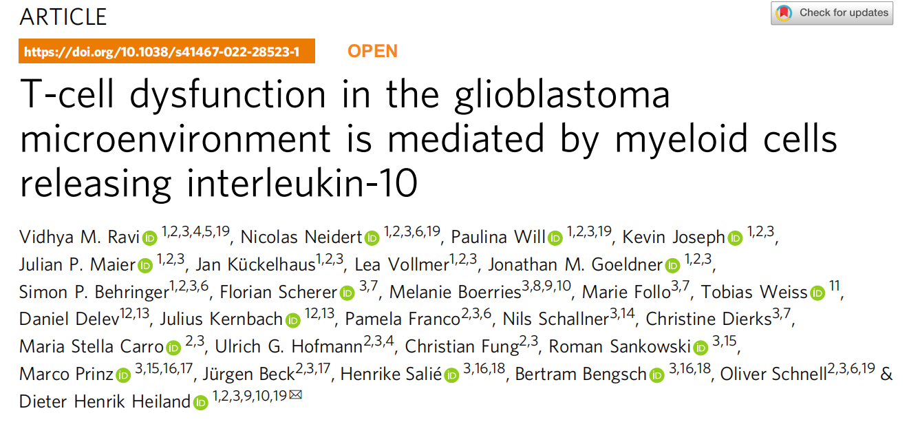 文章題目:T-cell dysfunction in the glioblastoma microenvironment is mediated by myeloid cells releasing interleukin-10