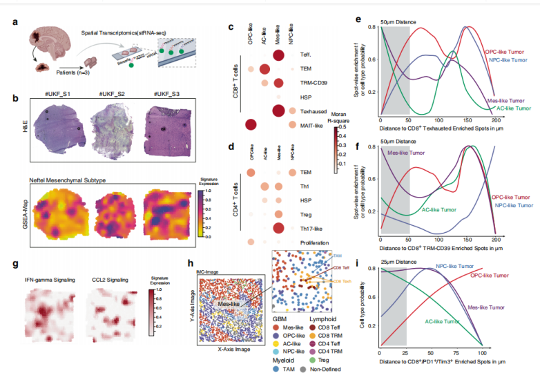 為了確定?T?細胞簇的空間位置信息,以及與特定腫瘤狀態(tài)共定位信息,作者進行了空間分辨轉錄組RNA測序(stRNAseq)。該團隊收集3名原發(fā)性GBM IDH1/2 Wt患者組織樣本,數據集總共包含2352個測序點,每個點的中位數為8個細胞(范圍:每個spot點捕獲4~22個細胞)。作者通過NMF回歸和Moran統(tǒng)計分析,發(fā)現CD8+T細胞簇與GBM亞型相關聯,腫瘤區(qū)域富集為間充質樣腫瘤(MES樣),星形膠質細胞樣(AC樣)轉錄特征與活化的CD8+效應子、CD8+T耗盡簇共定位。