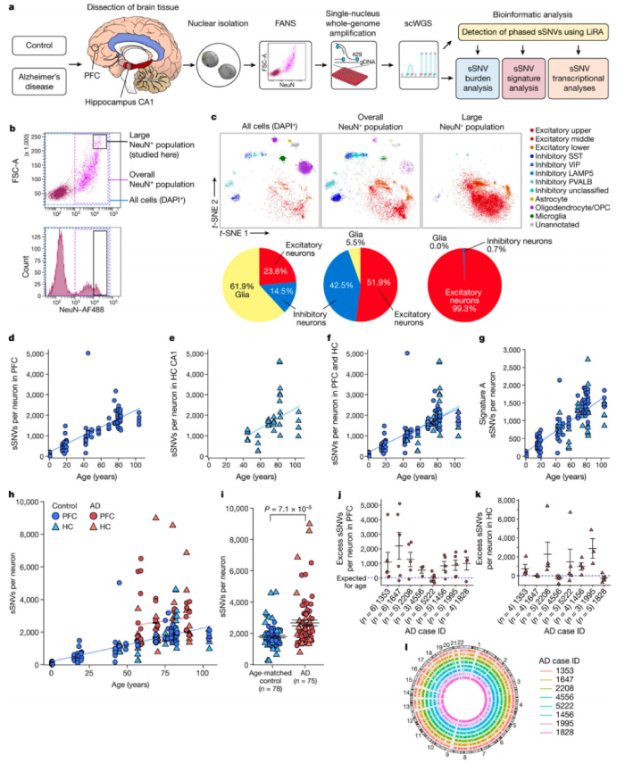 對(duì)從AD和神經(jīng)典型對(duì)照個(gè)體的大腦中分離出來(lái)的神經(jīng)元進(jìn)行了單細(xì)胞全基因組測(cè)序(scWGS),染色了泛神經(jīng)元標(biāo)記NeuN來(lái)標(biāo)記神經(jīng)元,并進(jìn)一步只標(biāo)記了大的NeuN陽(yáng)性核,使用多位移放大(MDA)進(jìn)行全基因組擴(kuò)增,分析了8例AD的91個(gè)神經(jīng)元和18個(gè)神經(jīng)典型對(duì)照組的159個(gè)神經(jīng)元。在神經(jīng)典型個(gè)體中,神經(jīng)元sSNVs隨著年齡的增長(zhǎng)而增加,sSNVs的年增長(zhǎng)率相當(dāng)高,從每年13到55個(gè)sSNV不等,在一些特殊細(xì)胞類(lèi)型中,分裂突變率更高。沒(méi)有神經(jīng)診斷的個(gè)體的海馬CA1神經(jīng)元顯示,隨著年齡的增長(zhǎng),sSNVs呈積累的趨勢(shì),這與神經(jīng)典型對(duì)照個(gè)體前額葉皮層(PFC)神經(jīng)元中看到的sSNV的增加沒(méi)有顯著差異。