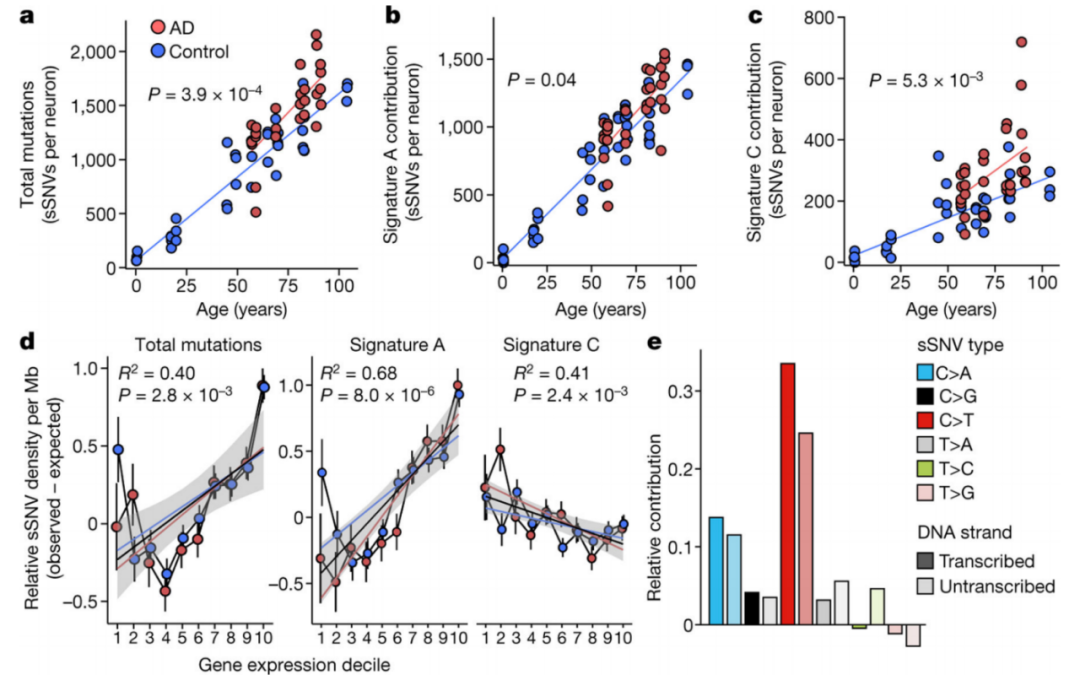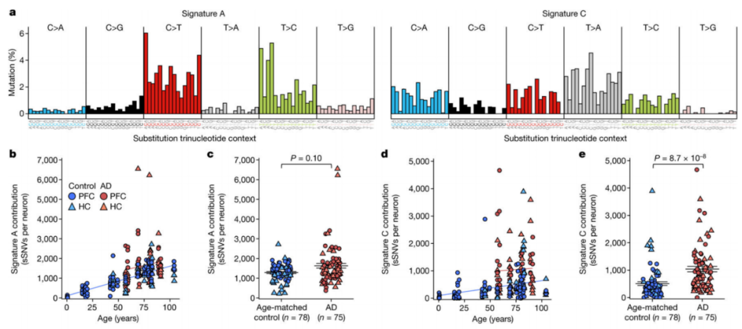 阿爾茨海默氏癥的癡呆癥隨著神經(jīng)變性的進(jìn)展而發(fā)展,但導(dǎo)致神經(jīng)元功能障礙和死亡的具體事件仍然鮮為人知。在正常衰老期間,神經(jīng)元以類(lèi)似于分裂細(xì)胞的速度逐漸積累軀體突變,這表明遺傳因素、環(huán)境暴露或疾病狀態(tài)可能會(huì)影響這種積累在這里,本文分析了來(lái)自阿爾茨海默病患者和神經(jīng)典型對(duì)照個(gè)體前額葉皮層和海馬體的319個(gè)神經(jīng)元的單細(xì)胞全基因組測(cè)序(scWGS)數(shù)據(jù)。發(fā)現(xiàn)阿爾茨海默氏癥患者的體細(xì)胞DNA改變?cè)黾?,分子模式不同,正常神?jīng)元主要以與年齡相關(guān)的模式(特征A)積累突變,這與之前在健康和癌細(xì)胞中描述的“時(shí)鐘狀”突變特征非常相似。神經(jīng)變性中DNA改變的異常積累為阿爾茨海默病發(fā)展過(guò)程中發(fā)生的分子和細(xì)胞事件的級(jí)聯(lián)提供了見(jiàn)解。