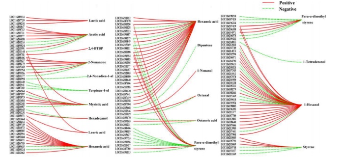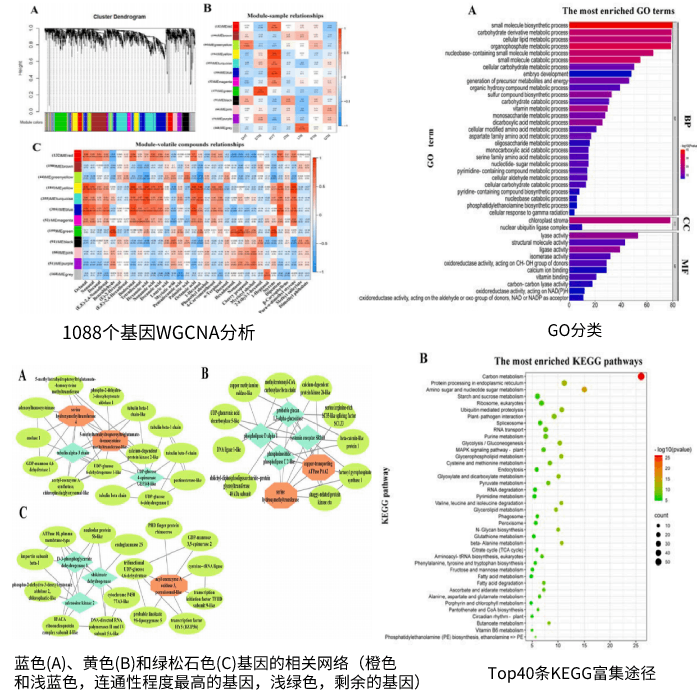 基因相關(guān)網(wǎng)絡(luò):三個(gè)模塊與揮發(fā)性化合物的合成具有高度的相關(guān)性,但三個(gè)模塊中的基因表現(xiàn)出不同的組成和表達(dá)模式,說明不同模塊中的基因在揮發(fā)性化合物的合成中可能發(fā)揮不同的功能。