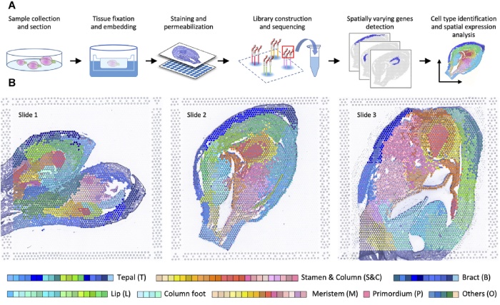 研究內(nèi)容:利用10x Visium空間轉(zhuǎn)錄組學(xué)數(shù)據(jù)分析了蝴蝶蘭花器官早期發(fā)育過程中基因表達(dá)的動態(tài)變化。通過對時(shí)空表達(dá)分布的比較,確定了在特定組織/階段優(yōu)先表達(dá)的數(shù)千個(gè)基因,包括MADS-box基因和許多其他潛在下游基因,形成了花器官初始化、身份決定和形態(tài)建成的模型。對蘭花開花發(fā)育過程進(jìn)行了系統(tǒng)的研究,為進(jìn)一步研究蘭花開花過程中復(fù)雜而重要的基因調(diào)控網(wǎng)絡(luò)提供了寶貴的資源。