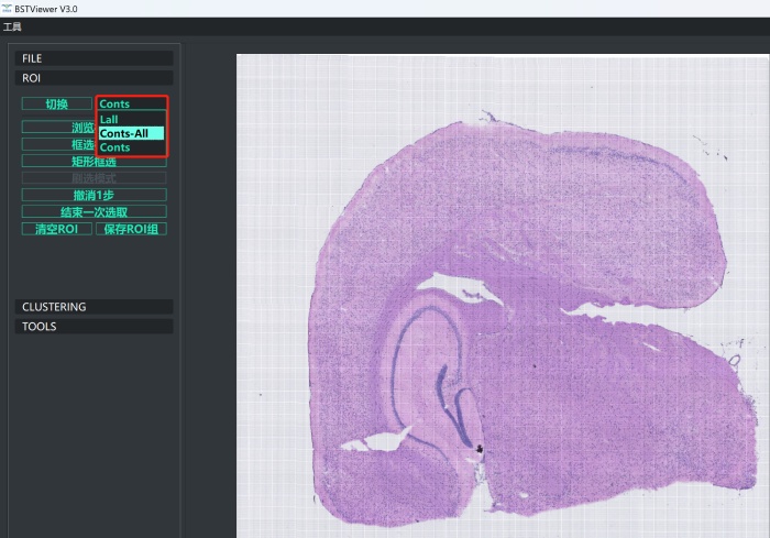 4)進(jìn)行ROI 創(chuàng)建。點(diǎn)擊“ROI”按鈕,此處可以選擇全局聚類和部分區(qū)域聚類。cont和conts-all分別代表在全局下聚類與全局扣除空白區(qū)域聚類。區(qū)域聚類的話目前提供了“框選模式”和“矩形框選”兩種模式??蜻x合適的區(qū)域后點(diǎn)擊“結(jié)束一次選取”,選擇“保存或摳除”,完成之后點(diǎn)擊“保存ROI組”并命名即可;
