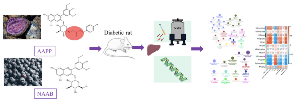 花色苷是植物中的一大類多酚化合物,目前已知是對氧化應激、炎癥和能量穩(wěn)態(tài)有調節(jié)作用。已有報道發(fā)現(xiàn)花色苷具有抗糖尿病的療效?;ㄉ盏暮诵慕Y構是花青苷,它可以糖基化形成非?;幕ㄇ嘬?,糖苷可以?;笮纬甚;幕ㄇ嘬?。且最近有研究表明,與未?;幕ㄇ嘬障啾?,?;ㄇ嘬站哂懈玫姆€(wěn)定性和抗氧化活性。本研究利用全長轉錄組學和核磁共振代謝組學方法,比較了非?;王;ㄉ諏μ悄虿〈笫蟾闻K基因表達和代謝的影響。這是第一次綜合應用這兩種強大的技術來研究肝臟基因表達和代謝產物的變化。