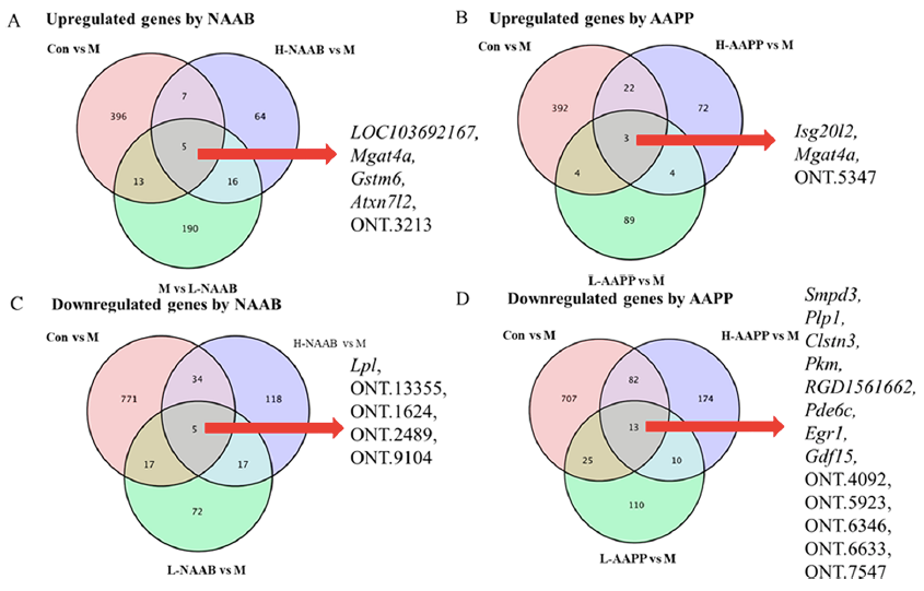 韋恩圖表明了不同分組之間上調和下調的DEG的交集,揭示了受NAAB和AAPP影響的特定基因(圖2A?D)。Gstm6與谷胱甘肽代謝、藥物代謝以及細胞色素P450對外源物質的代謝有關,在胰島素抵抗和糖尿病小鼠中均被報道下調,并可能參與T2D的進展。L-NAAB和H-NAAB均能恢復Gstm6的表達。與ND組和Con組相比,M組中有一個共同的基因被兩種花色苷提取物(NAAB和AAPP)上調,即編碼N-乙酰氨基葡萄糖轉移酶GnT-4a的Mgat4a。在小鼠中,Mgat4a基因的遺傳失活導致葡萄糖轉運蛋白2N-聚糖的錯誤組裝,導致葡萄糖轉運蛋白2和質膜凝集素Galectin 9之間的相互作用失敗,導致葡萄糖轉運蛋白2內化,從而抑制葡萄糖攝取和葡萄糖刺激的胰島素分泌。還發(fā)現(xiàn)高脂飲食抑制了Mgat4a的表達。藍莓的非?;ㄉ蘸妥仙R鈴薯的?;ㄇ嘬斩际侨绱?。編碼脂蛋白脂肪酶的LPL在小鼠肝臟中過表達,導致肝臟甘油三酯含量增加2倍,并導致胰島素抵抗,部分原因是對胰島素的反應受損,抑制內源性葡萄糖的產生。在本研究中,L-NAAB和H-NAAB都下調了ZDF大鼠高水平的LPL,這可能導致胰島素敏感性的改善。早期生長反應基因-1(Egr1)可被胰高血糖素短暫激活,介導胰高血糖素調節(jié)的糖異生。AAPP降低Egr1,這可能與糖異生減少有關。