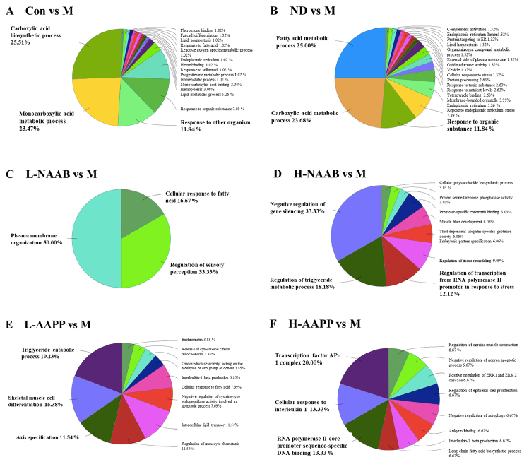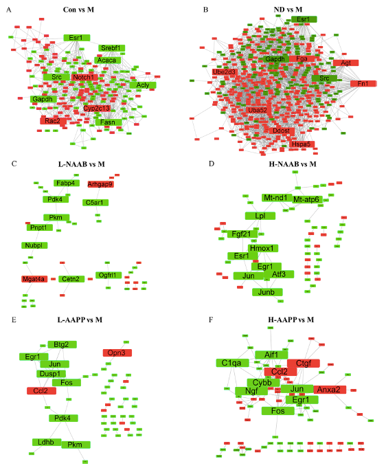 對不同分組中的DEGs進行ClueGO分析,以生成按功能分組的注釋網絡圖(圖4A?F)。在CON/M差異分組的結果中,DEGs主要富集在羧酸生物合成過程、單羧酸代謝過程和對其他有機物的反應過程。在ND/M分組差異結果中,脂肪酸代謝過程、羧酸代謝過程和對有機物的反應過程是富集排名前3的功能分組。在ND/M和CON/M分組中,DEGs主要在單羧酸代謝過程、羧酸生物合成過程、脂肪酸代謝過程、脂肪代謝過程和對有機物的反應過程相關的通路中富集。在L-NAAB/M分組差異結果中,DEGs組要與三個功能通過有關:質膜組織、感覺調節(jié)和細胞對脂肪酸的反應。在H-NAAB/M差異結果中,DEGs主要富集于基因沉默的負調控、甘油三酯代謝過程的調控以及RNA聚合酶II啟動子對脅迫反應的轉錄調控。在L-AAPP/M比較中,DEGs在甘油三酯分解代謝過程、骨骼肌細胞分化和軸規(guī)范方面都明顯富集。在H-AAPP/M差異結果中,發(fā)現(xiàn)轉錄因子AP-1復合體、細胞對白細胞介素-1的反應以及RNA聚合酶II核心啟動子序列特異性DNA結合等通路顯著富集。