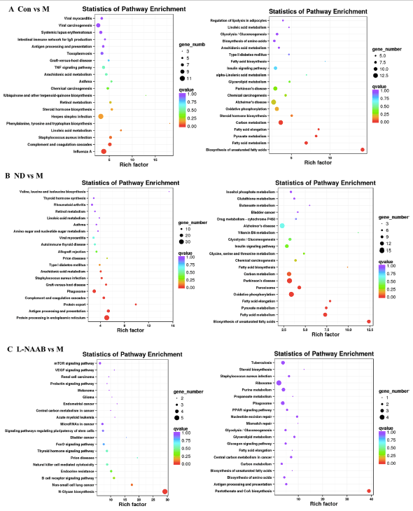 接下來,進行了KEGG通路富集分析。氣泡圖展示富集最顯著的前20條通路(圖5A?F)。與M組相比,Con組上調的DEGs主要富集于以下通路:苯丙氨酸、酪氨酸和色氨酸的生物合成,亞油酸代謝,金黃色葡萄球菌感染,補體和凝血級聯(lián)反應,以及甲型流感病毒。ND組與M組相比,上調的DEGs主要富集在花生四烯酸代謝、金黃色葡萄球菌感染、移植物抗宿主病、吞噬小體等通路中,而ND組與M組相比上調的DEGs主要富集在以下通路:苯丙氨酸、酪氨酸和色氨酸的生物合成、亞油酸代謝、金黃色葡萄球菌感染、移植物抗宿主病、吞噬小體。在CON/M和ND/M比較中,下調的DEGs在相似的KEGG通路中富集:不飽和脂肪酸的生物合成、脂肪酸代謝、丙酮酸代謝、脂肪酸伸長、氧化磷酸化和碳代謝。對于花色苷處理組,L-NAAB組上調的DEGs在N-糖鏈生物合成通路中顯著富集。L-NAAB組下調的DEGs在泛酸和CoA生物合成通路中顯著富集。在H-NAAB、L-AAPP和H-AAPP組中沒有發(fā)現(xiàn)下調的DEGs有顯著富集的通路,在H-NAAB和L-AAPP組中上調的DEGs也沒有富集的通路。H-AAPP中上調的DEGs在補體和凝血級聯(lián)、不飽和脂肪酸和變形蟲病的生物合成等通路中顯著富集。