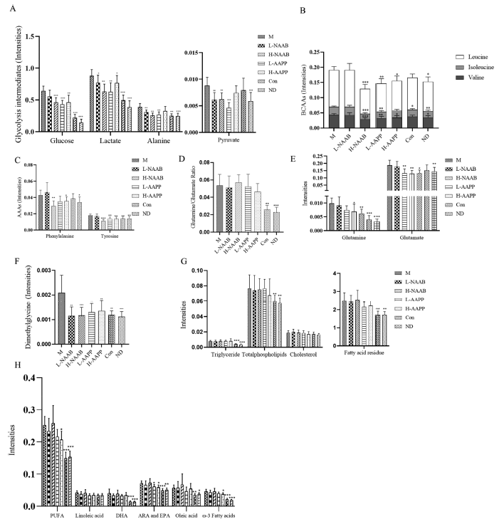 為了從代謝物水平上研究這些花青苷提取物對糖尿病ZDF大鼠肝臟的影響,進行了1H?NMR代謝組學研究。糖酵解代謝產物–肝葡萄糖、乳酸、丙氨酸和丙酮酸在M組升高。這可能反映了2型糖尿病患者糖酵解過度。此外,乳酸、甘油、丙氨酸和谷氨酰胺是主要的糖異生前體,占總糖異生的90%以上。結果表明,與對照組(CON和ND)相比,M組的糖酵解和糖異生水平升高。各花色苷處理組大鼠的血糖、乳酸、丙氨酸、丙酮酸和甘油水平均降低,而?;ㄉ?AAPP)處理組還降低了谷氨酰胺水平,表明花色苷提取物降低了肝臟葡萄糖產量,改善了糖酵解和糖異生代謝(圖6A)。GCK編碼的葡萄糖激酶和PKLR編碼的肝丙酮酸激酶是糖酵解過程中催化不可逆步驟的關鍵酶。GCK和葡糖激酶蛋白水平均降低。NAAB增加了GCK的表達,表明其作為葡糖激酶激活劑的潛在作用。AAPP顯著降低PKLR的表達,提示AAPP可能降低糖尿病大鼠的糖酵解(圖6B?C)。肝糖異生中的兩種限速酶是編碼G6PC(編碼葡萄糖6-磷酸酶催化亞基)和Pck1(編碼磷酸烯醇式丙酮酸羧激酶)。L-AAPP、H-AAPP和H-NAAB顯著降低肝臟中G6pc的表達,這與先前的qPCR結果一致,H-AAPP顯著降低了Pck1的表達。H-NAAB和AAPP在基因表達水平調控糖尿病糖酵解和糖異生。然而,ZDF大鼠中谷氨酰胺/谷氨酸比值對花青苷提取物無反應(圖6D),但L-AAPP和H-AAPP降低谷氨酰胺和谷氨酸,H-NAAB降低谷氨酸(圖6E)。與M相比,所有花青苷處理組的二甲基甘氨酸升高的水平都被逆轉到正常狀態(tài)(圖6F)。與M組相比,編碼甜菜堿-同型半胱氨酸S-甲基轉移酶的BHMT均降低。在脂質代謝產物方面,L-AAPP組和H-AAPP組的肝脂譜略有改善,表現(xiàn)為脂肪酸殘留量、包括ω-3脂肪酸在內的不飽和脂肪酸和Ara+EPA的下降趨勢(圖6G?H)。M組顯示出總體脂質譜增加,如高水平的磷脂、甘油三酯、脂肪酸和不飽和脂肪酸,所有這些都有助于脂肪肝的發(fā)展。L-AAPP和H-AAPP組通過調節(jié)脂肪酸殘基和不飽和脂肪酸略有改善肝脂代謝。