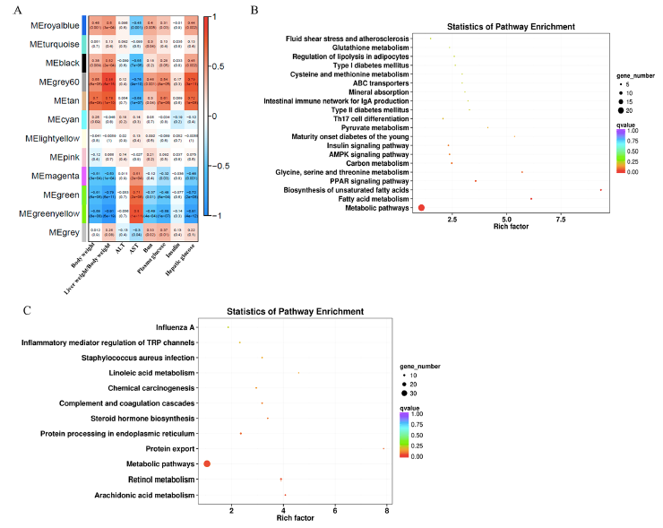 使用DEGs進行WGCNA分析以確定共表達模塊及其與臨床特征的相關性。確定了12個共表達模塊,并與以前報道的各種臨床特征(體重、AST、ALT、血尿素氮、血糖和胰島素)相關(圖7A)。MEgery 60和MEtan模塊與體重、肝重/體重比、血糖、肝糖呈正相關,與天冬氨酸轉氨酶呈負相關。MEgreen和MEgreenyellow模塊與體重、肝重/體重比、血糖、肝糖呈負相關,與AST值呈正相關。接下來,對MEgrey60和MEtan模塊以及MEgreen和MEgreenyellow模塊中的基因進行了KEGG通路富集分析。結果發(fā)現(xiàn)MEgrey60和MEtan中的基因富集的通路主要涉及脂類代謝(脂肪酸代謝、不飽和脂肪酸的生物合成、脂肪細胞脂解的調節(jié))、氨基酸代謝(甘氨酸、絲氨酸和蘇氨酸代謝、半胱氨酸和蛋氨酸代謝、谷胱甘肽代謝)、糖尿病(青少年成熟期糖尿病、II型糖尿病、I型糖尿病、胰島素信號通路)(圖7B)。MEgreen和MEgreenyellow模塊中的基因主要富集在花生四烯酸代謝、視黃醇代謝、代謝途徑、蛋白質輸出、內質網蛋白質加工、類固醇激素生物合成、補體和凝血級聯(lián)、亞油酸代謝以及TRP通道的炎癥介質調節(jié)(圖7C)。