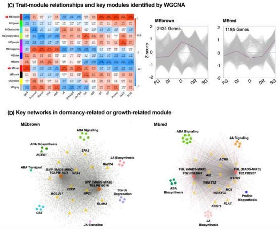 為了了解基因和通路的動態(tài)變化,并識別鳶尾越冬性休眠過程中的休眠相關(guān)模塊,我們對IJ的所有15118個差異轉(zhuǎn)錄本進(jìn)行了WGCNA分析,共鑒定出12個共表達(dá)模塊.對每個模塊進(jìn)行了主要的表達(dá)趨勢和KEGG富集分析。并進(jìn)行模塊-形狀關(guān)聯(lián)分析,選擇形狀特異性模塊和階段特異性模塊。結(jié)果中找到分別與冬季生長率呈顯著正、負(fù)相關(guān)的生長模塊(red)和休眠模塊(brown),MADS-box家族基因FUL/AP1和SVP分別位于兩個模塊,并與植物激素合成與信號轉(zhuǎn)導(dǎo)、碳水化合物代謝和環(huán)境響應(yīng)通路基因共表達(dá)。