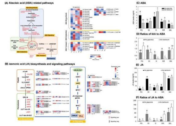 為了進(jìn)一步解剖鳶尾越冬休眠所必需的基因和通路,我們對基因表達(dá)譜和相關(guān)生理特征進(jìn)行了更詳細(xì)的研究。結(jié)果表明,脫落酸水平在D期升高了兩倍以上,并與SER呈顯著負(fù)相關(guān),表明脫落酸在鳶尾越冬休眠中的保守作用。脫落酸生物合成和分解代謝的穩(wěn)態(tài)jing q調(diào)控植物中的脫落酸水平。相比之下,IJ中參與脫落酸生物合成的差異轉(zhuǎn)錄本在DI過程中保持較低的表達(dá)水平。因此,作者推斷IJ中脫落酸水平的降低比IT中保證了更長的營養(yǎng)生長周期。推測這可能是由于脫落酸生物合成的抑制和分解代謝的活躍所致。