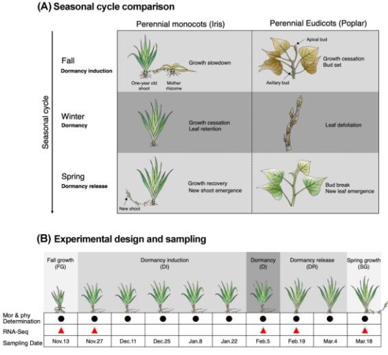 作者首先追蹤了鳶尾的季節(jié)性生長-休眠周期,發(fā)現(xiàn)其在休眠期間的形態(tài)變化不同于多年生雙子葉植物。通過一項大規(guī)模的野外實驗,將常綠鳶尾和落葉鳶尾植物暴露在不同的生長-休眠狀態(tài)下。兩種鳶尾均表現(xiàn)出相似但不同的生長-休眠動態(tài)。后續(xù)對采集的樣品進(jìn)行再生長試驗以驗證其休眠狀態(tài),兩種鳶尾均經(jīng)歷了短暫的休眠。值得注意的是,在同一階段,IJ相對于IT感知到更低水平的休眠誘導(dǎo)刺激。