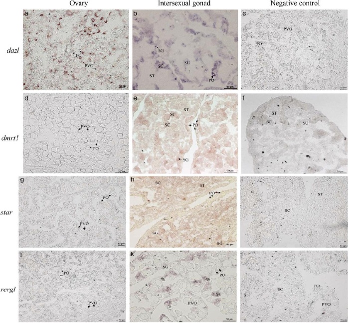 用原位雜交(ISH)技術(shù)分析了不同性腺階段性相關(guān)基因(dazl、Dmrt1、star、rergl)的定位。dazlmRNA僅限于斜帶石斑魚的雌性和雄性生殖細(xì)胞(卵母細(xì)胞、SG和SC)表達(dá)(圖9a、b),結(jié)果表明dazl是一種生殖細(xì)胞標(biāo)記物,在睪丸中高表達(dá),這與其他物種中dazl的表達(dá)一致。在自然雌性的卵巢中未檢測到Dmrt1信號(圖9d)。性逆轉(zhuǎn)后期的性腺有豐富的雄性生殖細(xì)胞SG、SC和ST,帶有dmrt1陽性信號,而卵母細(xì)胞沒有dmrt1信號(圖9e),因此dmrt1可以被認(rèn)為是斜帶石斑魚的生殖細(xì)胞標(biāo)記。star作為合成類固醇激素途徑中的限速酶,其在雄性斜帶石斑魚的睪丸中特異表達(dá),而在卵母細(xì)胞中未檢測到star信號(圖9g)。此外,發(fā)現(xiàn)starmRNA在SG、SC和ST中表達(dá)(圖9h)。rerglmRNA僅在雄性生殖細(xì)胞中檢測到(圖9j,k),這與RT-qPCR結(jié)果一致,暗示其在性別調(diào)節(jié)中的潛在作用。dazl、dmrt1、star和rergl的雜交探針作為對照實驗顯示性腺中沒有信號(圖9c、f、I、l)。