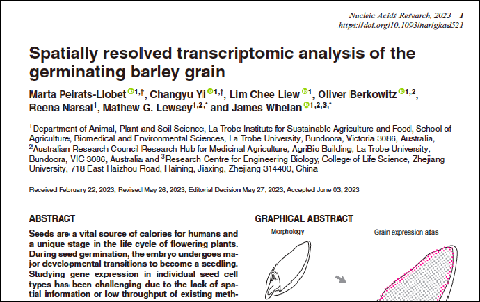 研究開發(fā)了大麥種子萌發(fā)過程的空間轉(zhuǎn)錄組學流程,通過進行高通量的空間基因表達分析,揭示了不同功能基因類別在亞組織水平上的特定空間表達模式,為大麥萌發(fā)提供了空間解析細胞圖,并確定了特定的功能基因組目標,以更好地理解萌發(fā)過程中的細胞限制過程。
