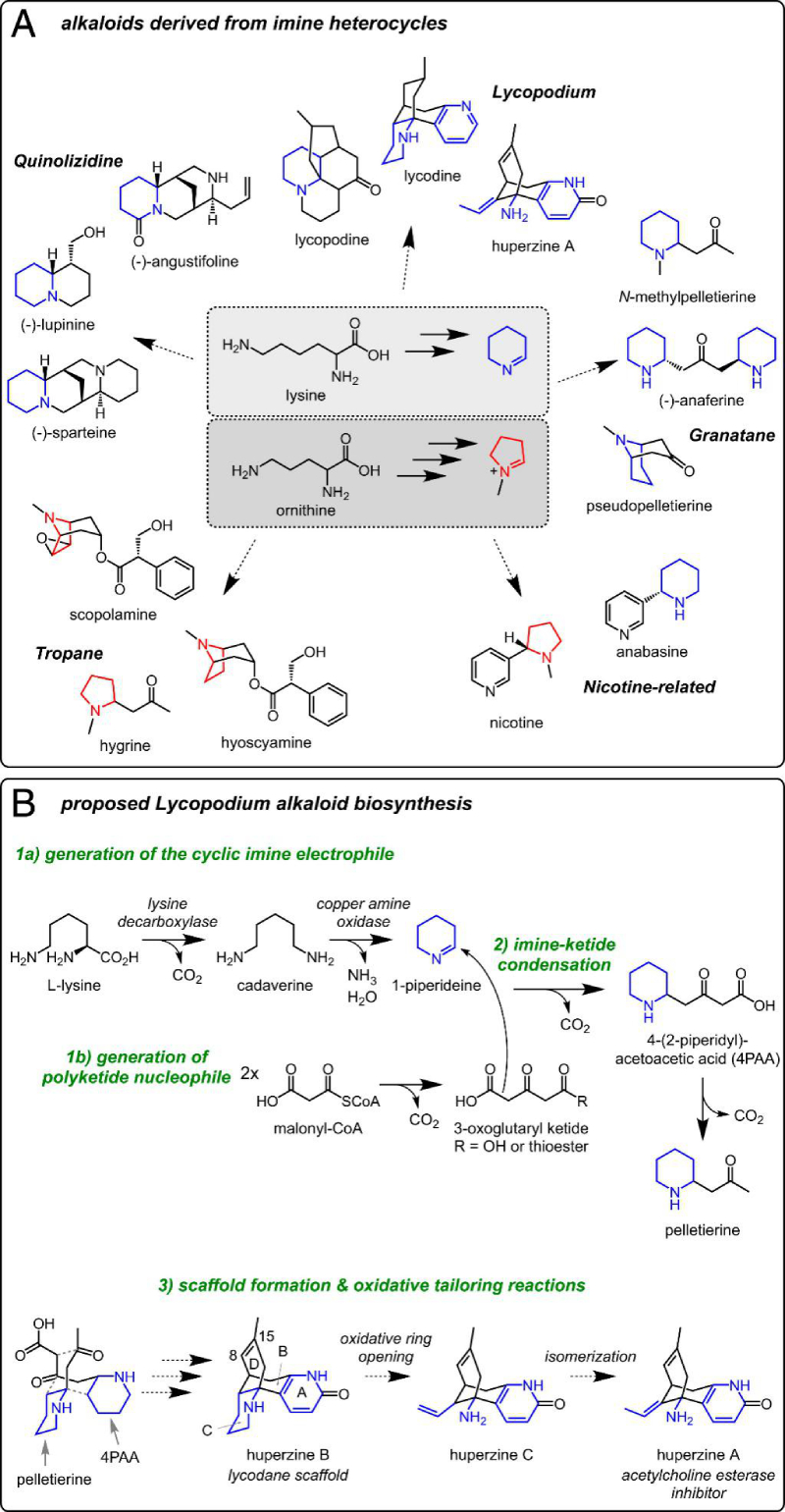 植物合成了許多能影響哺乳動(dòng)物中樞神經(jīng)系統(tǒng)的小分子化合物,成為治療神經(jīng)系統(tǒng)疾病藥物先導(dǎo)的重要來源。一些重要神經(jīng)活性植物代謝物是賴氨酸衍生的生物堿,但植物合成這類化合物的機(jī)制在很大程度上仍未被闡明。為了更好地理解植物如何合成這些代謝物,作者團(tuán)隊(duì)聚焦于傳統(tǒng)草藥石松(Club moss)Phlegmariurus tetrastichus中石松生物堿(Lycopodium alkaloids)的生物合成研