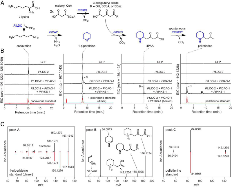 接下來,推測(cè)通過向 1-哌啶聚合物中添加丙二酰輔酶 A 衍生的聚酮鏈以產(chǎn)生 4-(2-哌啶基)乙酰乙酸(4PAA),該酸可以脫羧產(chǎn)生peletierine(圖 1B)。聚酮底物的產(chǎn)生表明聚酮合酶(PKS)酶參與催化這種亞胺-酮縮合反應(yīng),并在石松生物堿的生物合成中起作用。進(jìn)一步分析揭示了兩個(gè)PKS候選基因(PtPIKS-1和PtPIKS-2),與PtLDC-1共表達(dá)基因之一(圖2C)。PtPIKS-1 PtPIKS-2與PtLDC-2 和PtCAO-1在煙草葉片中的瞬時(shí)共表達(dá)導(dǎo)致1-哌啶代謝物的消耗和幾種新化合物的產(chǎn)生。其中一種化合物具有與假定的石松生物堿前體peletierine相對(duì)應(yīng)的精確質(zhì)量數(shù) ([M+H]=m/z