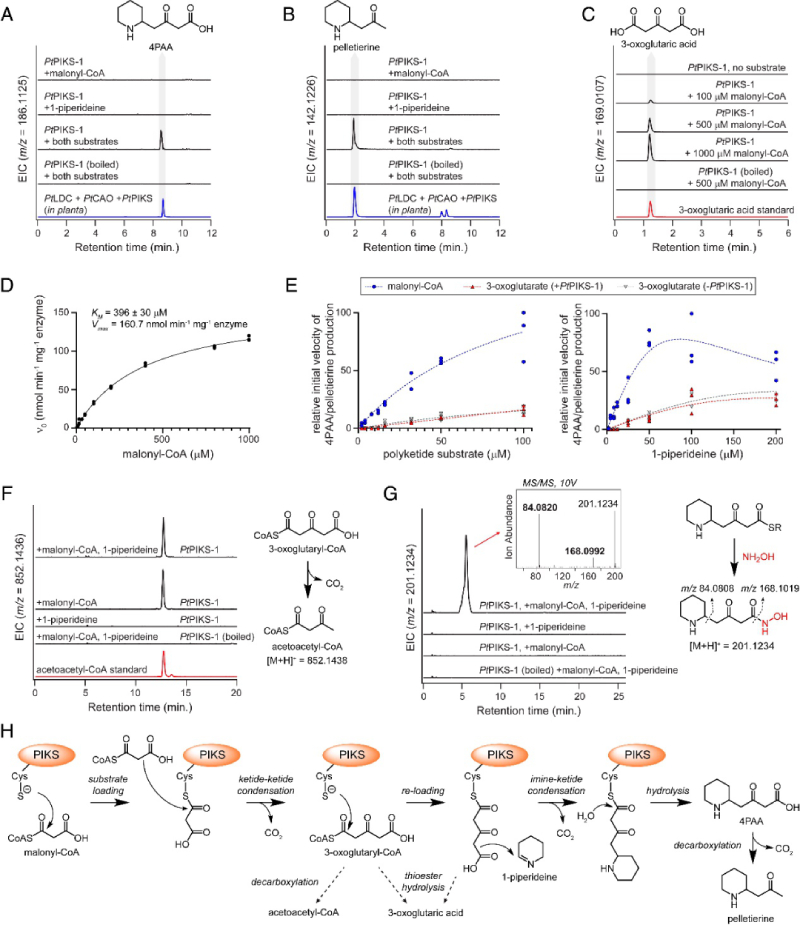為了更好地了解這種亞胺-酮縮合的機(jī)制,獲得了兩種PtPIKS同源基因的純化蛋白用于體外分析。與我們?cè)诒臼綗煵葜械慕Y(jié)果一致,當(dāng)添加 1-哌啶和丙二酰輔酶 A 作為底物時(shí),PtPIKS-1和PtPIKS-2在體外測(cè)定中都產(chǎn)生了4PAA和pelletierine(圖4 A和B),此外還有其他幾種未知化合物。雖然當(dāng)單獨(dú)孵育 1-哌啶作為底物時(shí)沒有觀察到明顯的產(chǎn)物,但僅向PtPIKS-1添加丙二酰輔酶 A 會(huì)導(dǎo)致 3-氧代戊二酸的積累(圖 4 C 和 D)。3-氧代戊二酸的積累表明,PIKS能夠催化兩個(gè)丙二酰輔酶A單元縮合成硫酯連接的3-氧代谷氨酰基團(tuán),并且該聚酮酸從硫酯鍵上酶促或非酶水解。