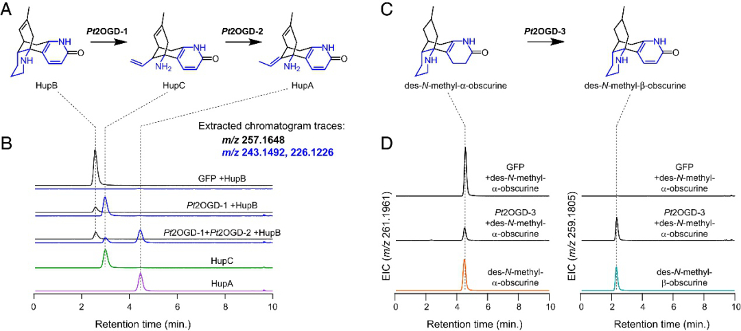 為進(jìn)一步研究其他下游生物合成途徑。特別是,兩種石松生物堿,des-N-methyl-α-obscurine(DNMAO)和des-N-methyl-β-obscurine(DNMBO),與HupB共享相同的碳骨架,可能是HupB的前體(圖 5)。因此作者通過與上述已知基因的高共表達(dá)分析及體外酶活驗(yàn)證實(shí)驗(yàn)發(fā)現(xiàn)另一種獨(dú)特的2OGD酶(Pt2OGD-3)能將DNMAO轉(zhuǎn)化為DNMBO(圖5),從而形成最終在HupA中發(fā)現(xiàn)的吡啶酮環(huán)。并且發(fā)現(xiàn)Pt2OGD-1和Pt2OGD-2可以依次作用于DNMBO,以產(chǎn)生假定的HupC和HupA的8,15-二氫同系物。Pt2OGD-1不作用 DNMAO,表明在DNMBO和HupB中發(fā)現(xiàn)的吡啶酮環(huán)的存在對(duì)Pt2OGD-1底物結(jié)合和/或催化活性至關(guān)重要,但是參與其中的去飽和酶尚未被發(fā)現(xiàn)。