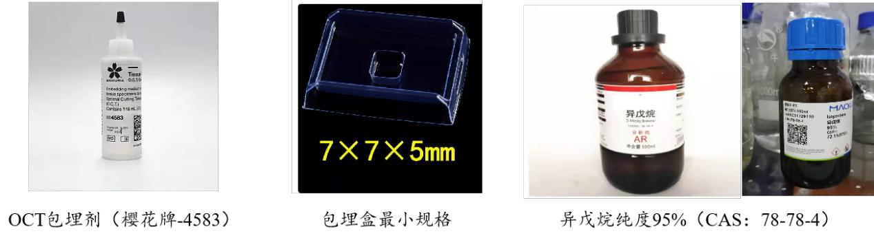 注:原則上實(shí)驗(yàn)室不提供組織冷凍包埋相關(guān)試劑,需客戶網(wǎng)上自行購(gòu)買,如有需要請(qǐng)聯(lián)系運(yùn)營(yíng)確認(rèn)實(shí)驗(yàn)室是否有存貨,因 OCT 試劑無(wú)法分裝運(yùn)送,實(shí)驗(yàn)室也僅僅可提供包埋盒。