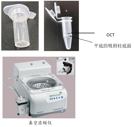 3)冰上預(yù)冷75% OCT包埋劑溶液(5mlOCT+2.5ml滅菌水顛倒混勻),1.5ml離心管中加入1ml 75%OCT,將植物組織浸潤(rùn)在其中,將平底的無(wú)吸附膜的吸附柱放入1.5ml離心管中,以防止抽真空過(guò)程組織上浮在OCT表面,打開(kāi)所有管蓋,置于真空濃縮儀中(注意配平)。室溫抽真空10min,摸索設(shè)置成V-AQ,促進(jìn)OCT溶液充分包裹和進(jìn)入組織空隙中,保證OCT填充包埋組織的完整性。如下圖: