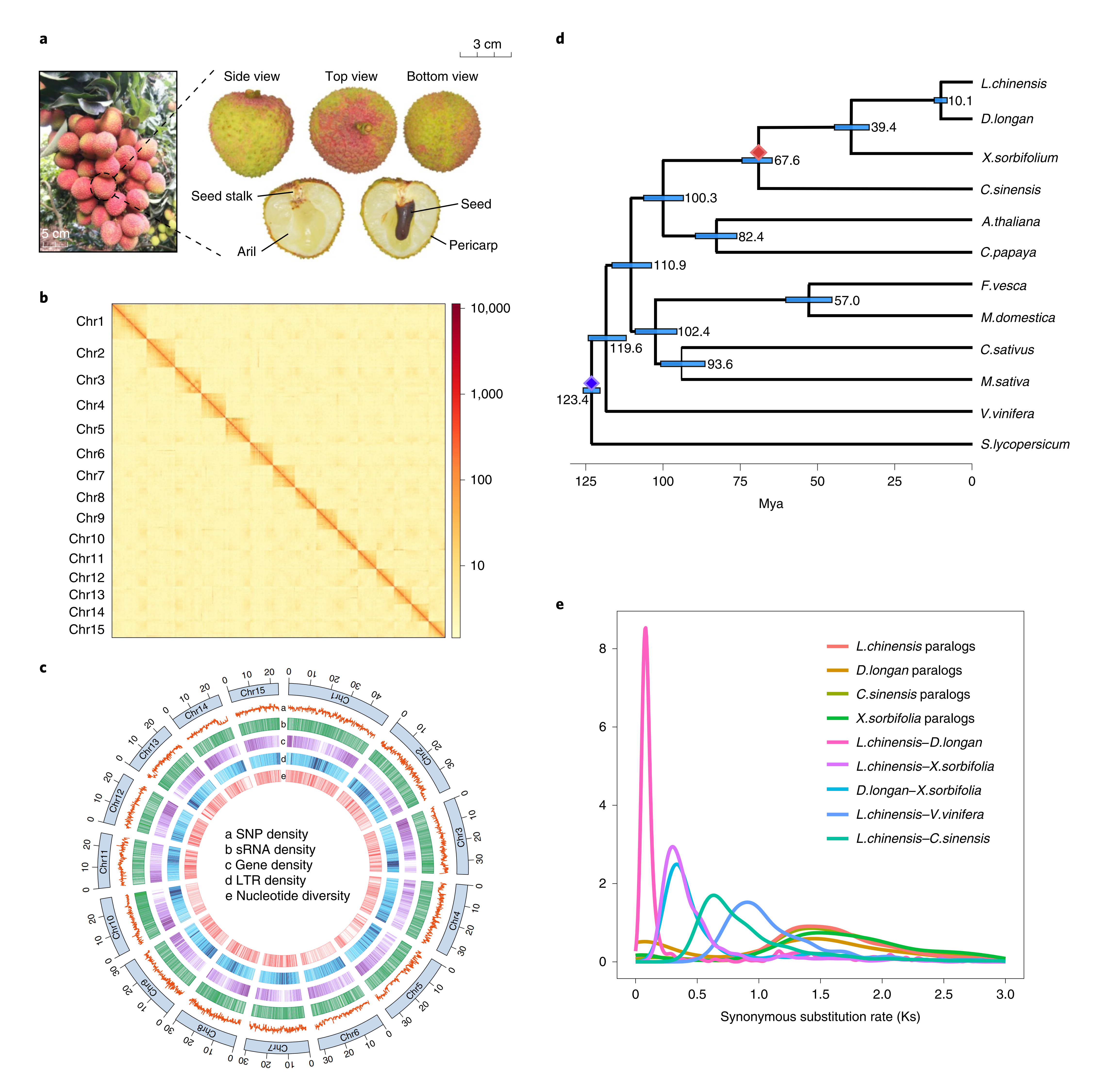 比較基因組分析表明,荔枝和龍眼-10百萬年前(mya)從祖先物種中分離開來,而荔枝所在的無患子科與蕓香科大約在67.6mya分離開。荔枝、龍眼、文冠果和甜橙自共享y三倍化事件后并無獨立的WGD事件。