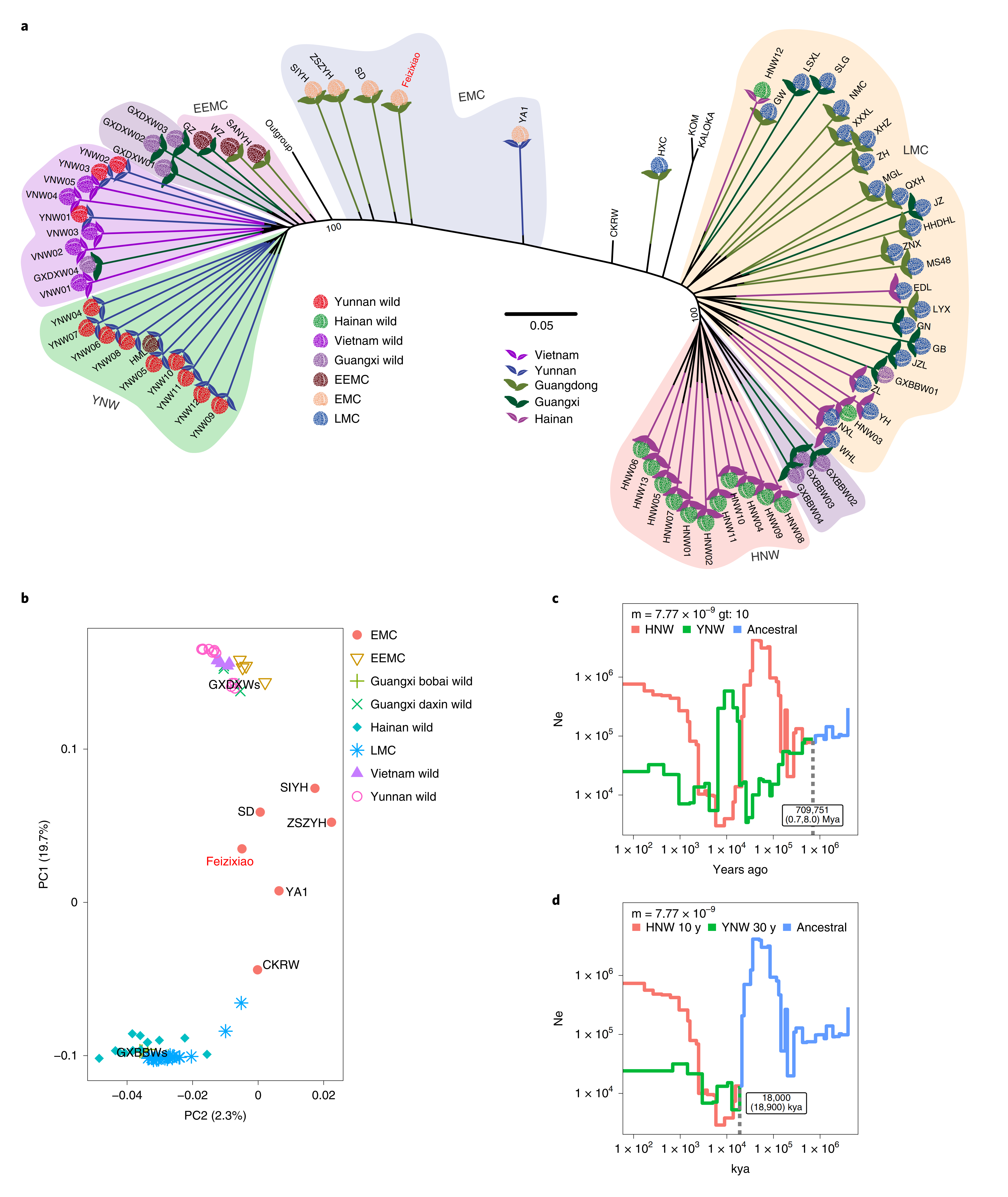 利用通過對72份荔枝進行重測序分析,發(fā)現(xiàn)荔枝大致可分為3個群體,即云南極早熟品種(EEMC/YNW)、海南晚熟品種(LMCHNW)、早熟栽培種(EMC)。其中值得注意的是,大新野生和博白野生荔枝雖然都位于廣西,但兩者間卻存在明顯的遺傳差異。分析發(fā)現(xiàn)云南野生種群經(jīng)歷了強烈的馴化瓶頸。