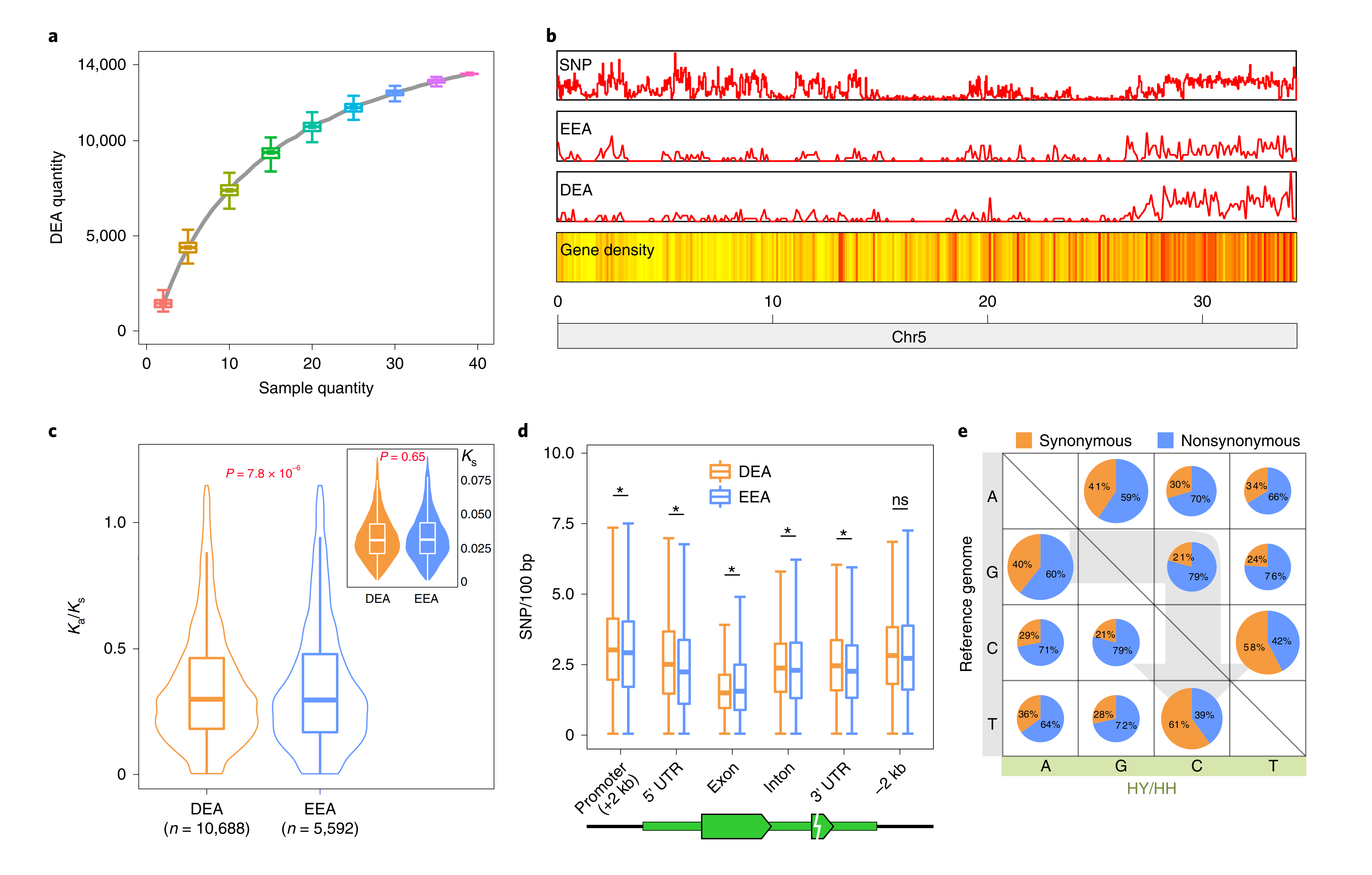 作者通過SNP分型和單細胞10x?Gemomics測序,利用“妃子笑”荔枝的高雜合性(2.27%),成功獲得的兩個單倍型的基因組(云南單倍型,HY;海南單倍型,HH)。對39個妃子笑”不同組織和時期樣本進行轉錄組測序分析,共鑒定到13517個等位差異表達基因(DEA)。DEA在基因組上的分布并不是均勻的,在某些區(qū)域具有集中現(xiàn)象,可能與特定的生物學過程相關。還發(fā)現(xiàn),DEA和等位等量表達基因(EEA)具有相同的Ks值,但是DEA經(jīng)受更強的選擇壓力。