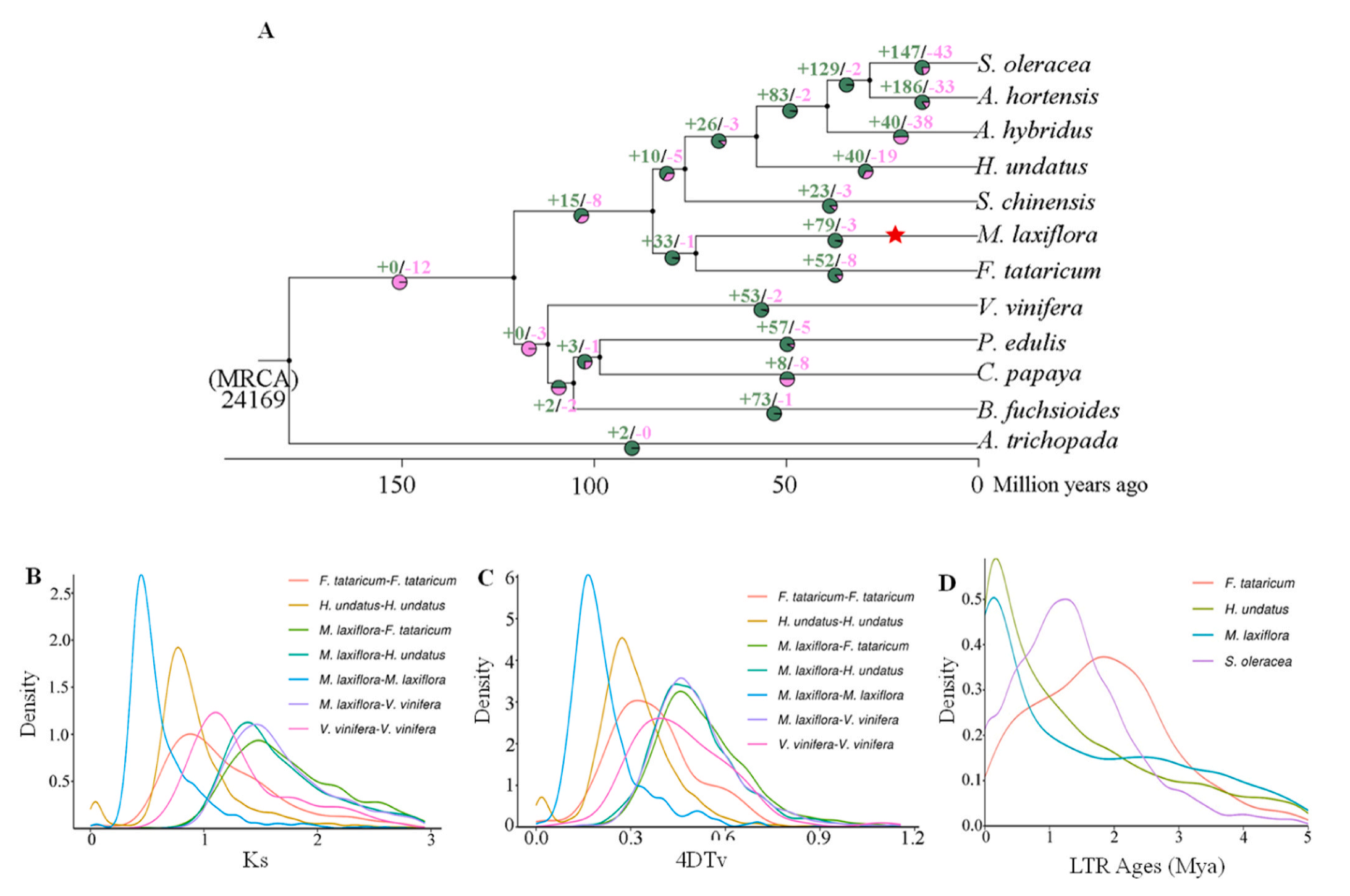 比較基因組研究發(fā)現(xiàn)疏花水柏枝與苦蕎(F. tataricum)的親緣關(guān)系最為密切,大約在65-81百萬(wàn)年前(Mya)發(fā)生分化;在19.74 ~ 24.60 Mya之間發(fā)生了一次全基因組復(fù)制(WGD), 4dTV分析證實(shí)了這一點(diǎn)。在0.15 Mya左右存在一個(gè)長(zhǎng)末端重復(fù)(LTR)插入。這些基因組變化可能與疏花水柏枝在進(jìn)化過程中所經(jīng)歷的環(huán)境劇變(如青藏高原隆升)有關(guān)?;蚣易宸治鲲@示疏花水柏枝的特有基因家族與能量代謝和信號(hào)轉(zhuǎn)導(dǎo)密切相關(guān);85個(gè)基因在疏花水柏枝基因組中經(jīng)歷了正選擇,這些基因在與氨基酸合成和代謝相關(guān)的KEGG通路中顯著富集。