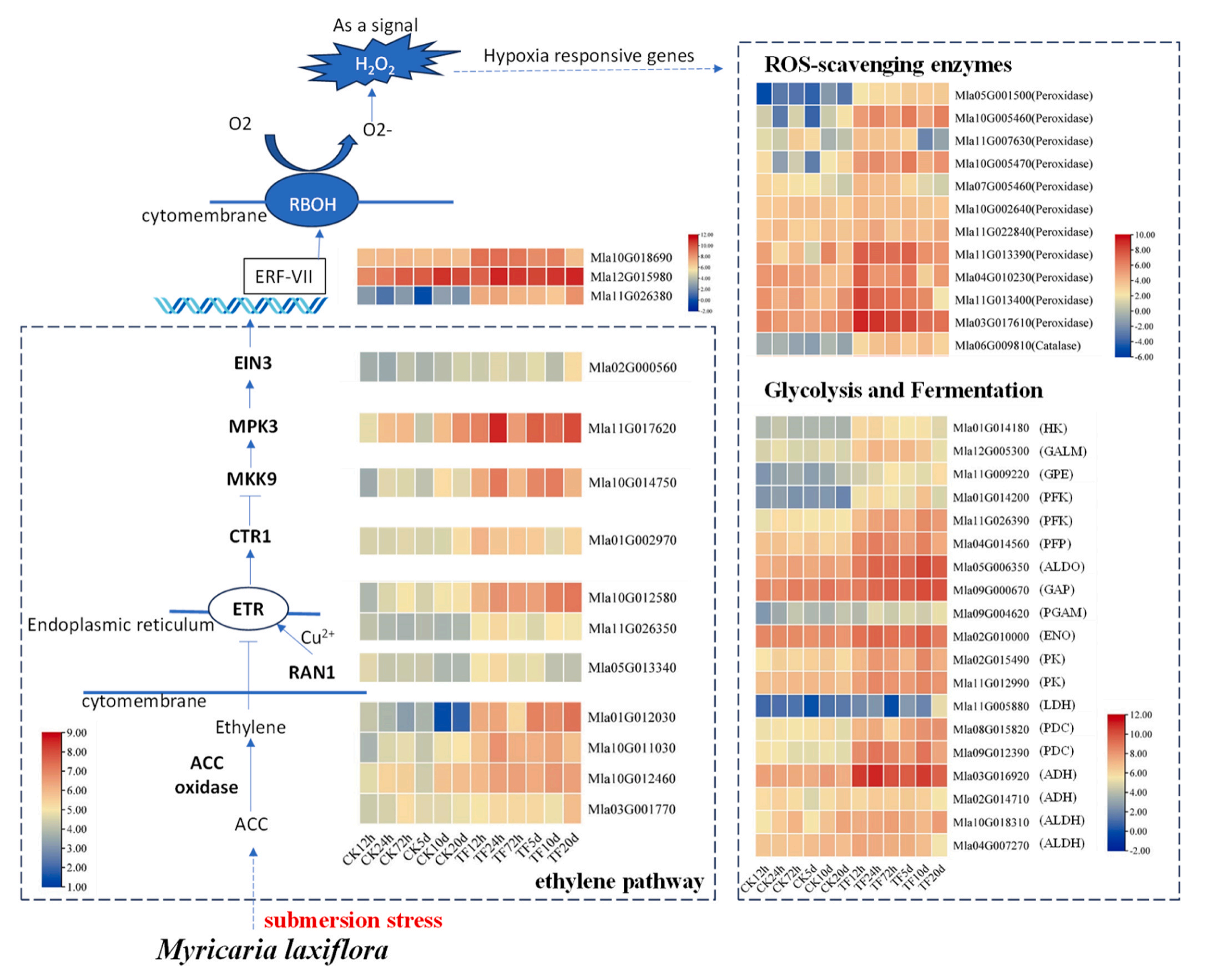 作者通過比較水淹和對(duì)照條件下疏花水柏枝形態(tài)、生理和轉(zhuǎn)錄組學(xué)的變化,分析了植物對(duì)水淹的適應(yīng)機(jī)制??傮w而言,在完全淹沒的狀態(tài)下,疏花水柏枝采用“靜止”的策略。具體來(lái)說,在淹水條件下,光合作用減弱,生長(zhǎng)停滯,糖酵解被激活,抗氧化酶系統(tǒng)增強(qiáng)。乙烯反應(yīng)途徑可能是這一過程的調(diào)控因子,MlERF-VII基因(Mla11G026380)可能是調(diào)控這一過程的關(guān)鍵基因。