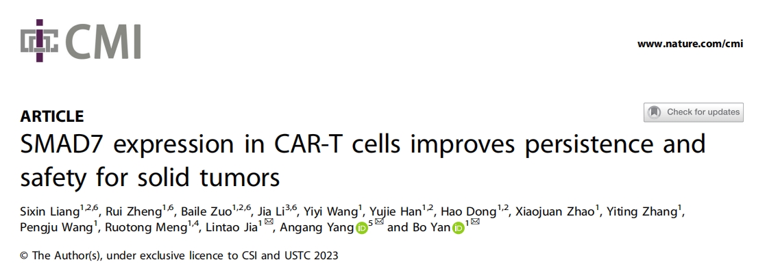 [2] Liang S, Zheng R, Zuo B, Li J, Wang Y, Han Y, Dong H, Zhao X, Zhang Y, Wang P, Meng R, Jia L, Yang A, Yan B. SMAD7 expression in CAR-T cells improves persistence and safety for solid tumors.?Cell Mol Immunol.?2024Mar;21(3):213-226. doi: 10.1038/s41423-023-01120-y. Ep ub 2024 Jan 4
