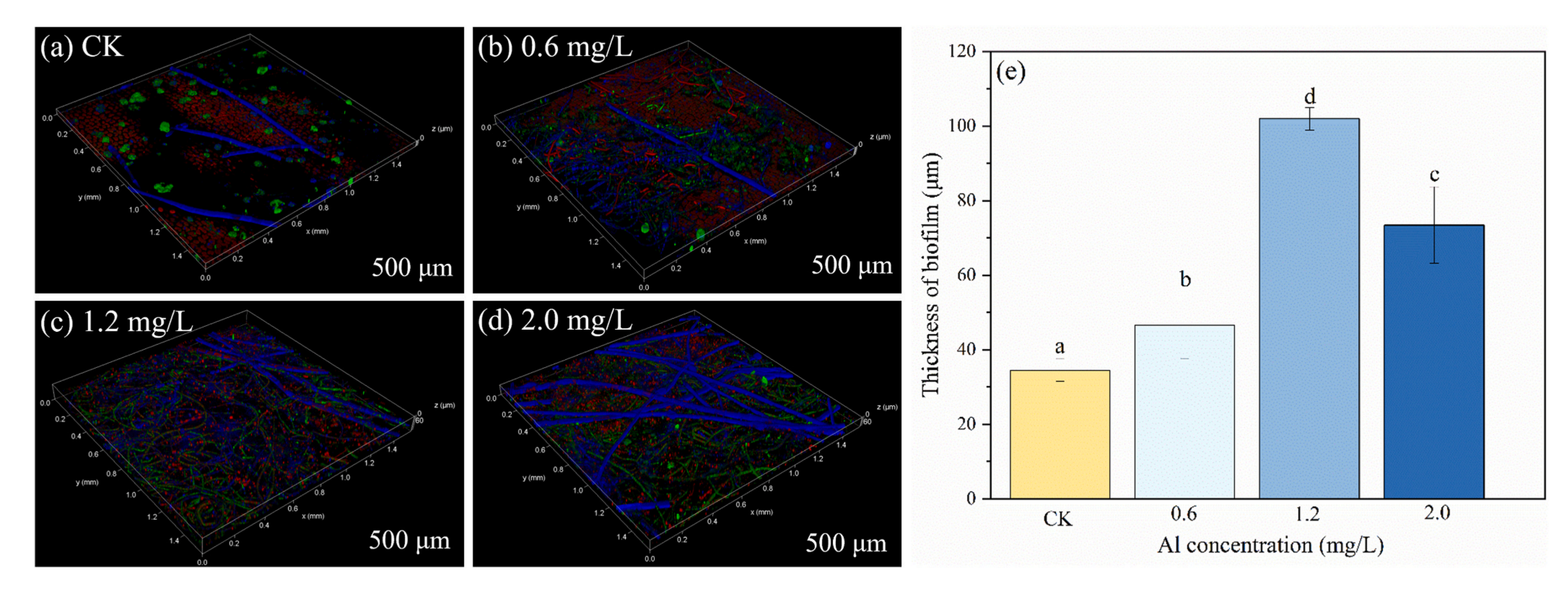 隨著Al濃度的升高,葉片上的生物膜聚集情況逐漸增加。利用多重熒光染色和CLSM,我們觀察了Al處理下生物膜組分的不同性質,注意到核酸濃度在1.2 mg/L組達到峰值(圖1c)。藻類密度和附著生物膜厚度隨Al濃度的增加而增加,1.2 mg/L組最大厚度為101.94μm,CK組為34.50μm(圖1e)。結果表明,鋁處理促進了苦草附著生物膜的生長。所觀察到的現(xiàn)象可能歸因于Al離子分散到水生環(huán)境中,隨后與水體中的氮和磷形成聚集體。這些聚集體通過沉降作用積聚在沉水植物葉片表面,增加附著生物膜內的氮和磷含量,促進附著微生物的生長。