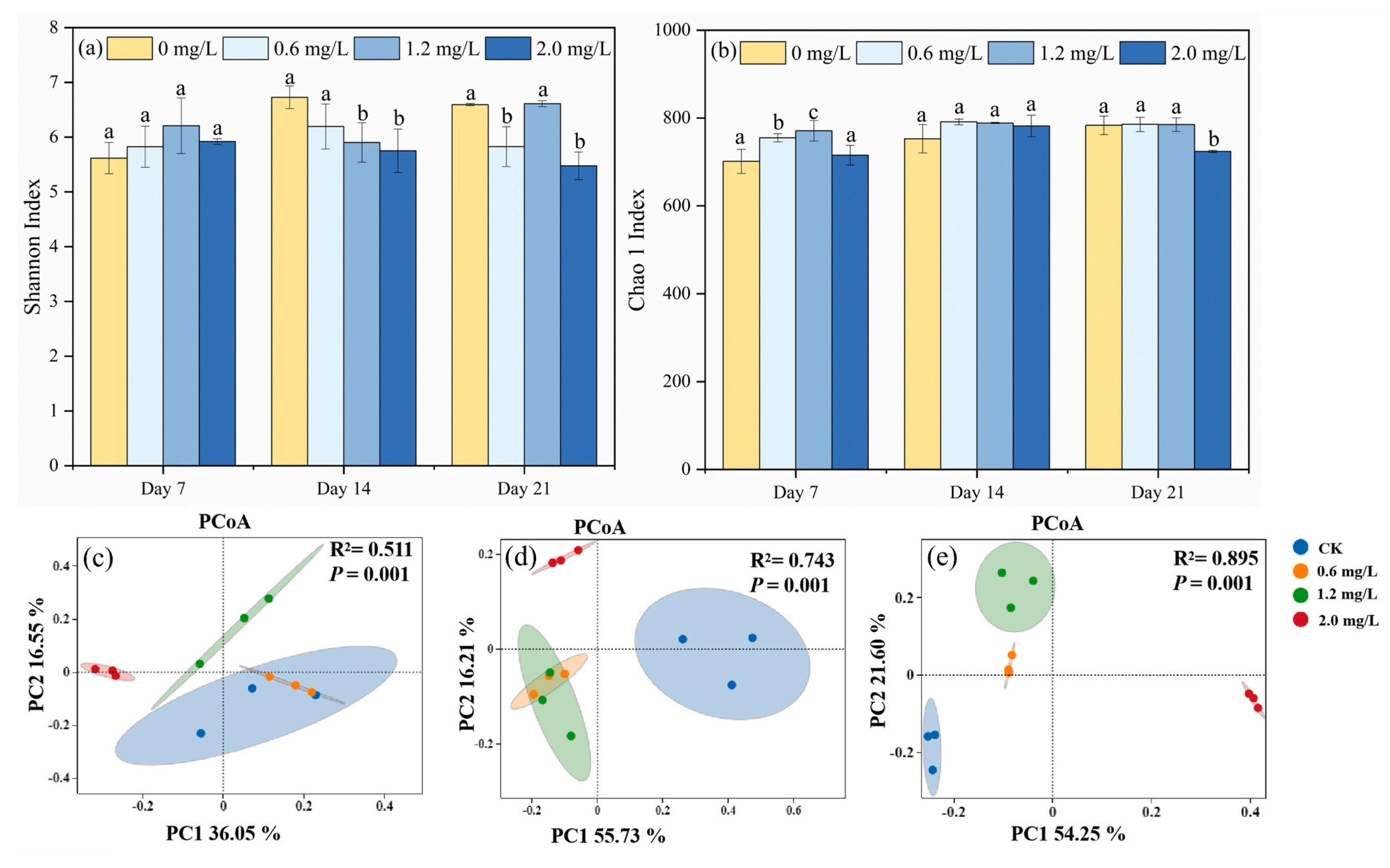 第14天,CK和0.6 mg/L組的Shannon多樣性均高于1.2和2.0 mg/L組(圖2a),處理間Chao1指數(shù)無顯著變化(圖2b, P>0.05);