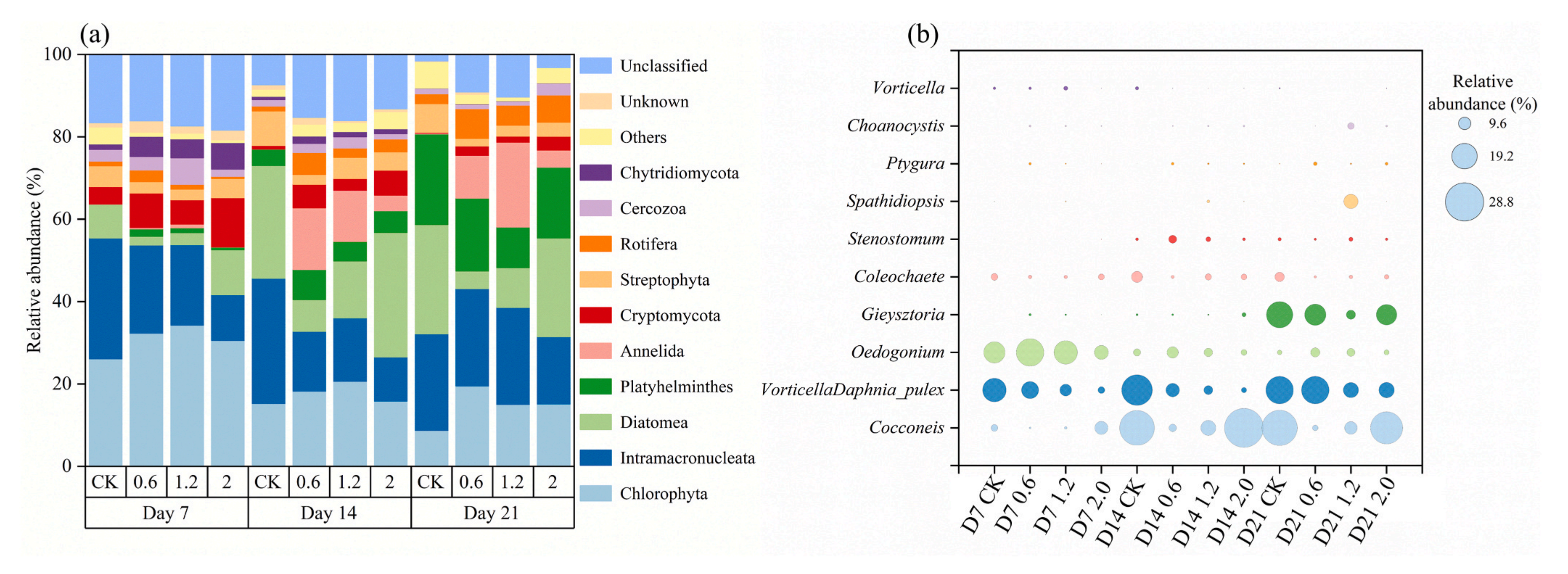 根據(jù)注釋結果,在所有樣本中鑒定出10個優(yōu)勢的微型真核生物門,分別是Chlorophyta(8.71–34.25%),Intramacronucleata (10.69–30.43%),Diatomea (2.11–30.24%), Platyhelminthes (0.02–22.00%),Annelida (0.04–20.60%), Cryptomycota (0.21–11.99%), Streptophyta (1.84–8.37%),Rotifera (0.52–7.23%),Cercozoa (0.91–6.45%),Chytridiomycota (0.07–6.42%) (圖5a)。值得注意的是,在處理組中Rotifers的豐度顯著增加(圖5a)。在實驗后期,尤其是處理組,PlatyhelminthesAnnelida的相對豐度有所增加(圖5a)。