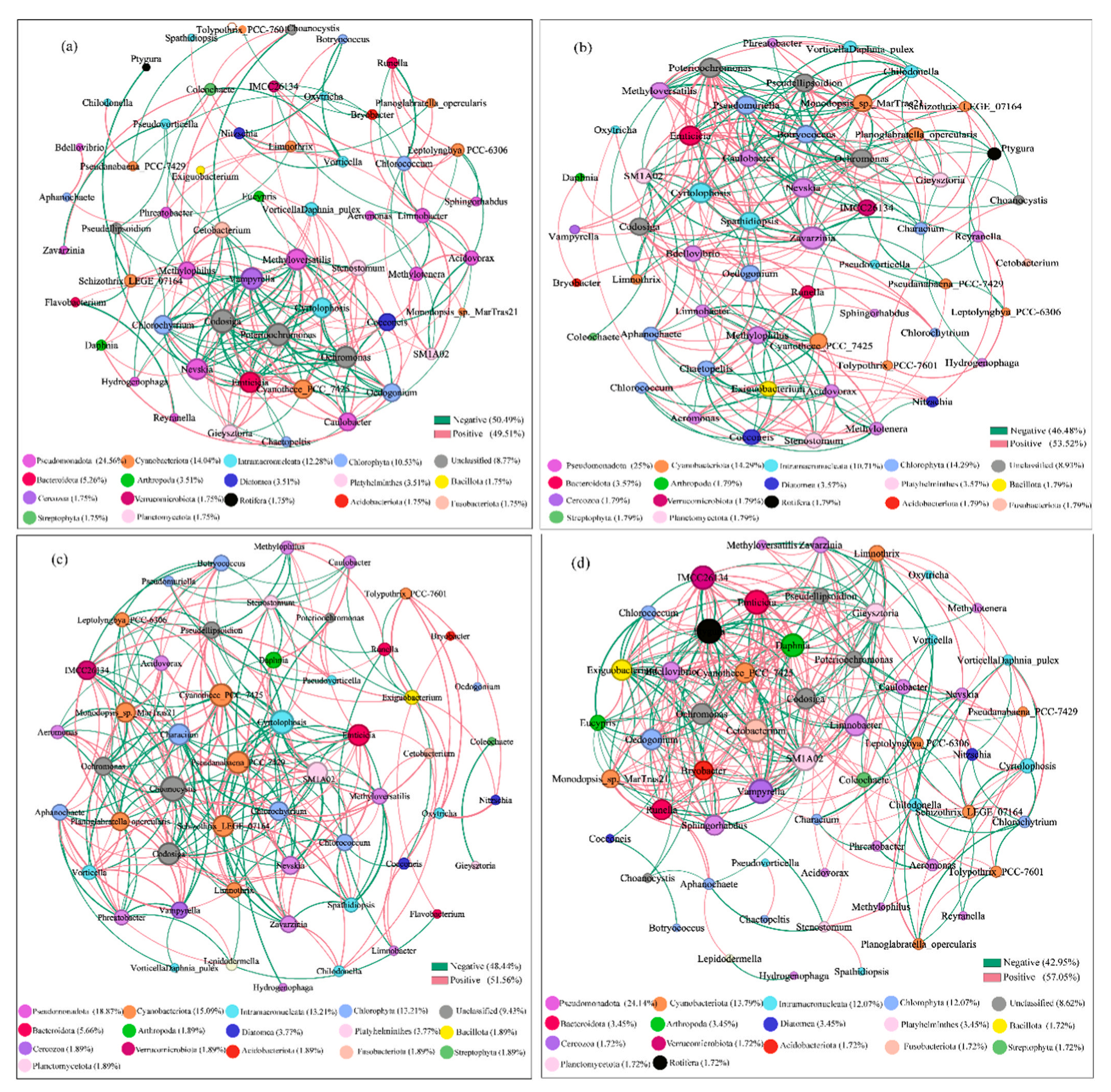 圖7-不同處理組附著生物膜中細菌和微型真核生物群落的相關網(wǎng)絡圖,(a)CK,(b)0.6 mg/L,(c)1.2 mg/L,(d)2.0 mg/L。(圓圈代表物種,同一顏色屬于同一門,圓圈的大小代表豐度;線代表兩個物種之間的相關性,線的顏色:粉紅色代表正相關性,綠色代表負相關性)。