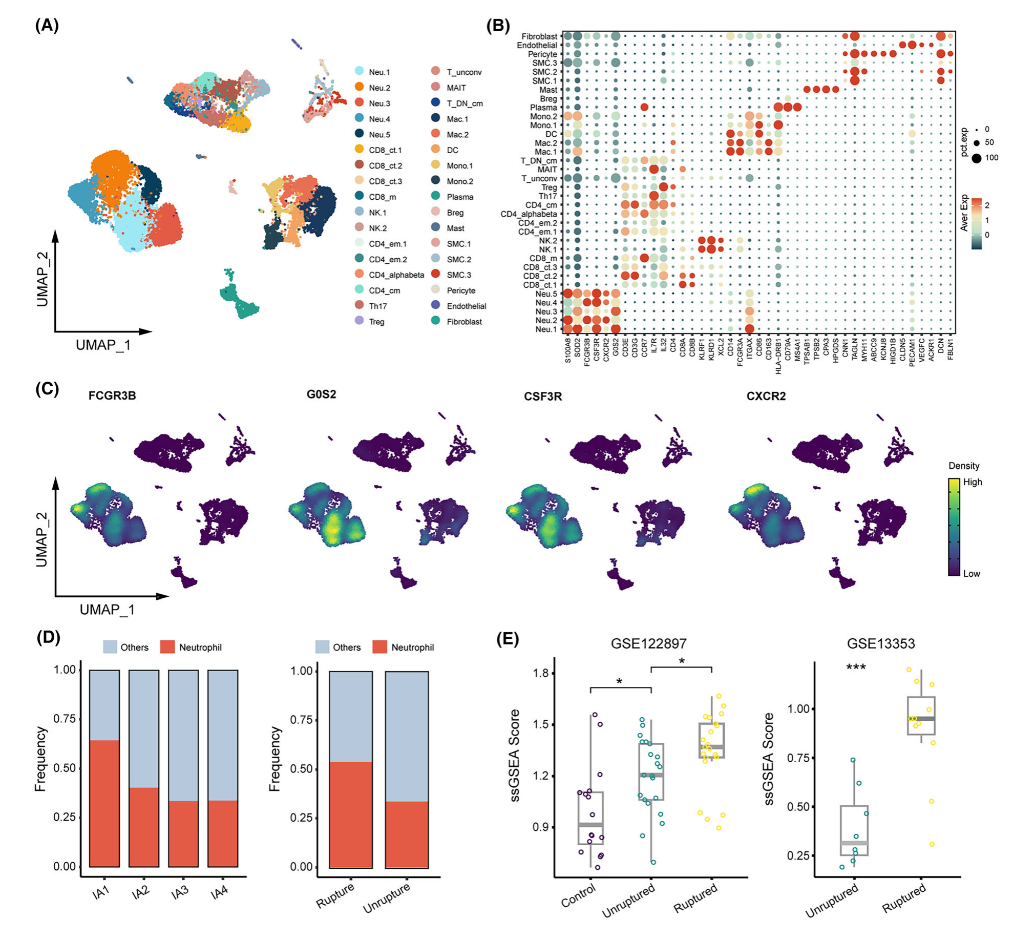 根據(jù)之前明確的基因標(biāo)記,包括FCGR3B、CSF3R、CXCR2G0S2,總共9025個(gè)中性粒細(xì)胞被人工分配(圖1A–C)。該研究進(jìn)一步使用 Azimuth 自動(dòng)注釋這些細(xì)胞,得到 8435 個(gè)中性粒細(xì)胞。IA1 是一種破裂的 IA 組織,與其他樣本相比,其中性粒細(xì)胞數(shù)量最多(圖1D)??傮w而言,IA 破裂時(shí)中性粒細(xì)胞較多,這可能與 IA 破裂及隨后的局部血栓形成有關(guān)。值得注意的是,ssGSEA 分析顯示,中性粒細(xì)胞浸潤(rùn)發(fā)生在 IA 破裂階段。根據(jù)中性粒細(xì)胞獨(dú)特表達(dá)的標(biāo)記基因,當(dāng) IA 破裂時(shí),IA 形成和中性粒細(xì)胞數(shù)量增加(圖1E)。總之,這些結(jié)果強(qiáng)烈表明中性粒細(xì)胞參與 IA 進(jìn)展。