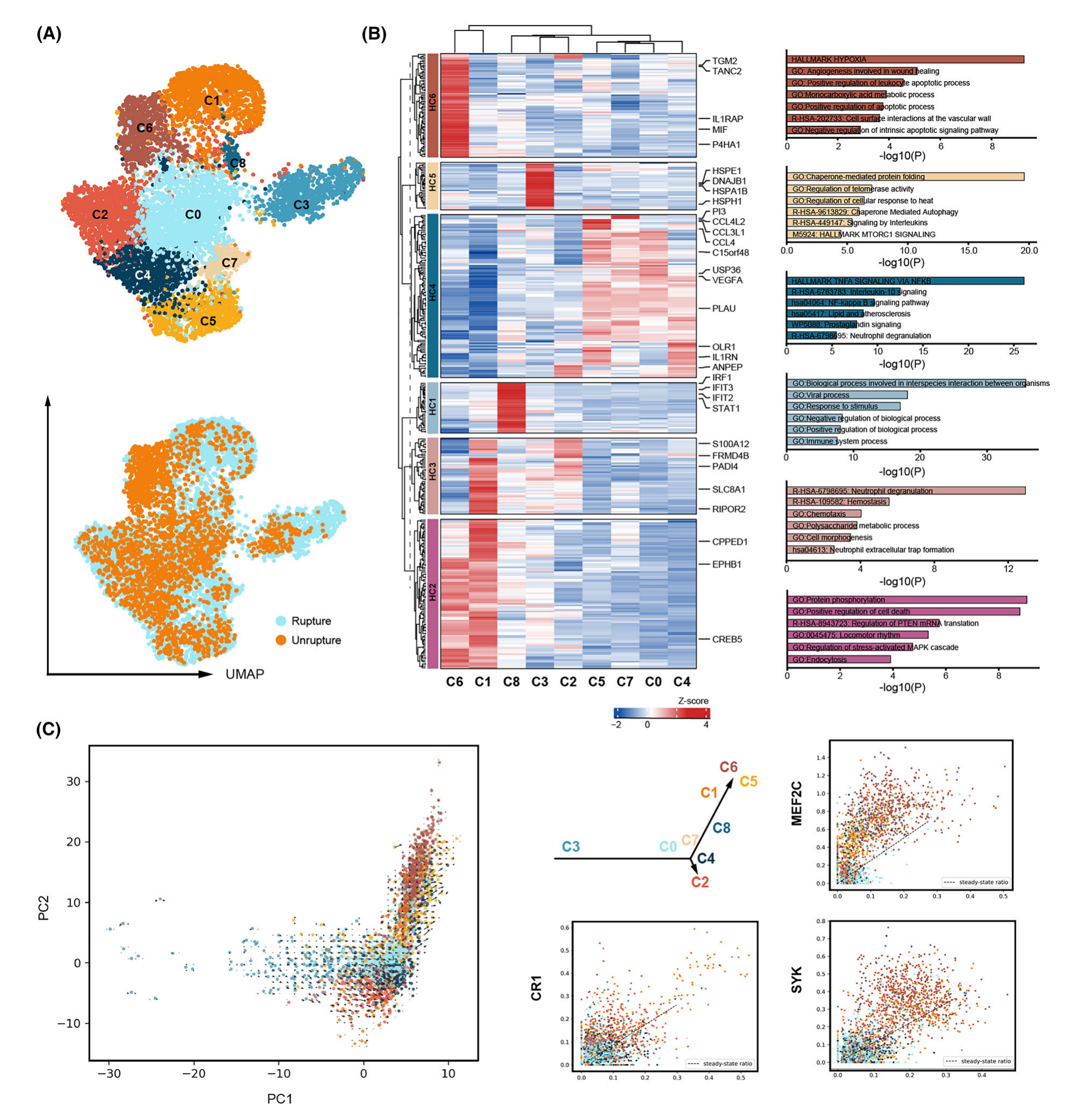 先前的研究表明中性粒細(xì)胞的功能和進(jìn)化具有異質(zhì)性,而IA穹隆中的中性粒細(xì)胞亞群仍然知之甚少。該研究使用“FindClusters”功能以更高分辨率(分辨率?=?0.9)重新聚類中性粒細(xì)胞,以識(shí)別不同的中性粒細(xì)胞群落。結(jié)果,鑒定出八個(gè)中性粒細(xì)胞亞群(C0-C7)(圖2A-B)。富集分析揭示了 C1 和 C6 中細(xì)胞凋亡途徑的正調(diào)節(jié)富集。具體而言,中性粒細(xì)胞胞外池?(NET) 的形成促進(jìn) IA 破裂,在 C1 中富集。對(duì)應(yīng)激反應(yīng)、脫顆粒和 NET 形成在 C8 中豐富,伴侶介導(dǎo)的蛋白質(zhì)折疊和自噬在 C3 中豐富,表明這些細(xì)胞也受到應(yīng)激。TNF、NF-κB 和中性粒細(xì)胞脫粒等通路在 C0、C4、C5 和 C7 中富集,表明這些細(xì)胞執(zhí)行中性粒細(xì)胞的促炎功能。此外,還進(jìn)行了 RNA 速度分析來(lái)描繪中性粒細(xì)胞亞簇的潛在軌跡。結(jié)果,這些細(xì)胞形成了包含兩個(gè)分支的軌跡。C5 和 C6 亞簇可能是軌跡的末端,CR1、MEF2C?和?SYK?參與細(xì)胞凋亡(圖 2C)。