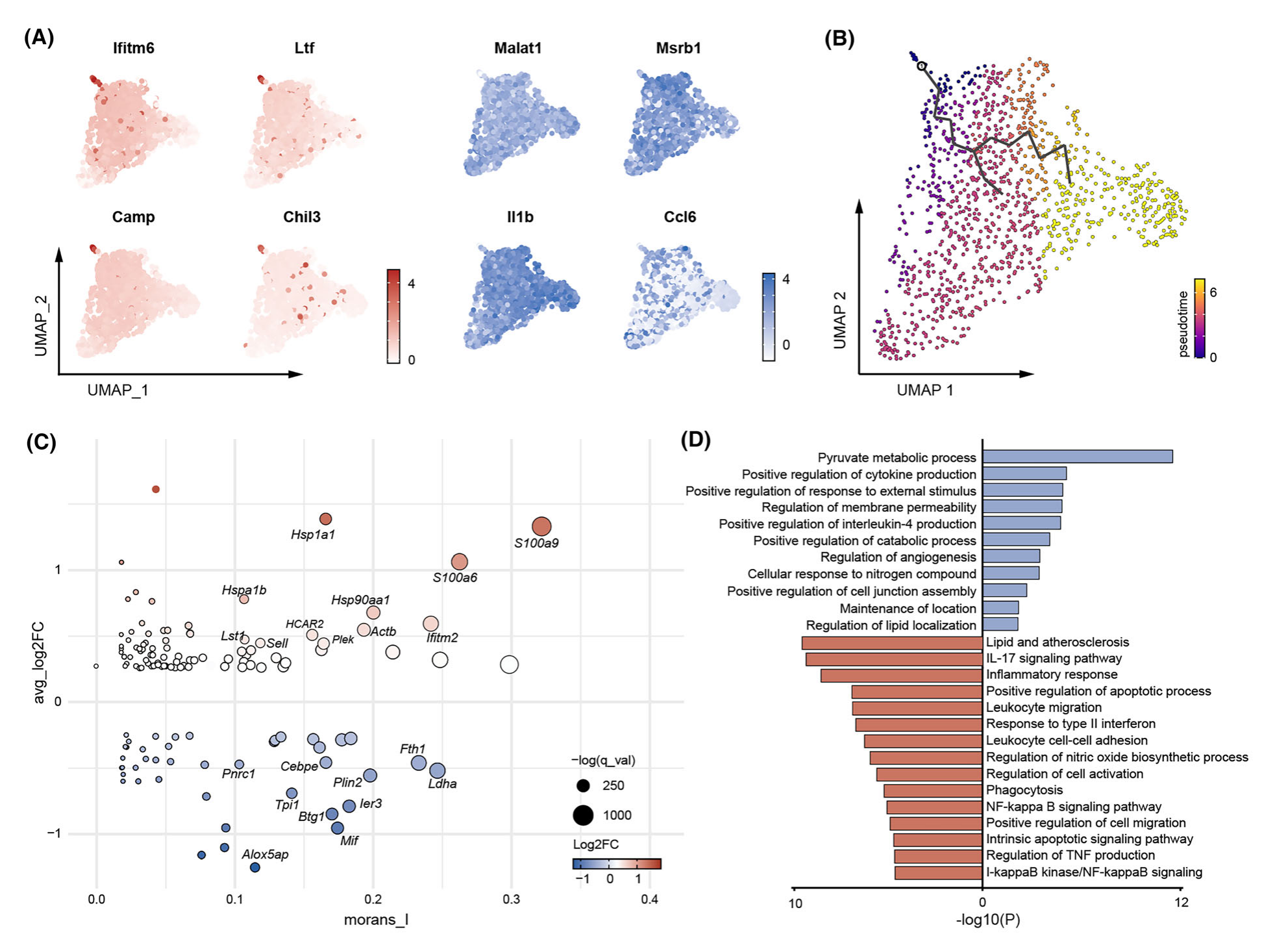 最近的研究根據(jù)中性粒細(xì)胞從骨髓到外周血的遷移決定了中性粒細(xì)胞的轉(zhuǎn)錄組特征,即“中性粒細(xì)胞”。該研究基于scRNA-Seq數(shù)據(jù)集研究了小鼠 IA 模型中性粒細(xì)胞浸潤(rùn)到IA組織時(shí)是否存在這種轉(zhuǎn)錄組特征。結(jié)果顯示假手術(shù)中存在少量中性粒細(xì)胞富集,并形成小鼠模型高表達(dá)的基因標(biāo)記,包括Ifitm6、Ltf、Camp?和?Chil3。這些細(xì)胞表達(dá)較低成熟或老化的基因標(biāo)記,如Malat1、Msrb1、Il1bCcl6(圖?3A),表明它們是從外周血新滲入的。執(zhí)行單片算法來(lái)識(shí)別細(xì)胞進(jìn)化軌跡,并將這些新滲透的細(xì)胞指定為起點(diǎn)(圖3B)。根據(jù)莫蘭斯指數(shù) (morans I) 以及未破裂(假手術(shù))和破裂小鼠模型中的基因表達(dá),該研究計(jì)算了 IA 組織中新浸潤(rùn)和老化中性粒細(xì)胞的基因特征(圖3C)。與之前的研究一致,新浸潤(rùn)的中性粒細(xì)胞高表達(dá)Cebpe,在粒細(xì)胞生成和炎癥因子產(chǎn)生中發(fā)揮作用,而相對(duì)老化的中性粒細(xì)胞表達(dá)S100a 家族基因和伴侶,如?Hspa1b、Has1a1??Hsp90aa1,表明壓力或衰老狀態(tài)。富集分析揭示了這些細(xì)胞的不同功能,新浸潤(rùn)的中性粒細(xì)胞中富集了多種代謝途徑,而老化的中性粒細(xì)胞則激活了炎癥和凋亡相關(guān)途徑(圖3D)??傊@些結(jié)果表明 IA 組織中存在中性粒細(xì)胞,并強(qiáng)調(diào)了它們的功能異質(zhì)性。
