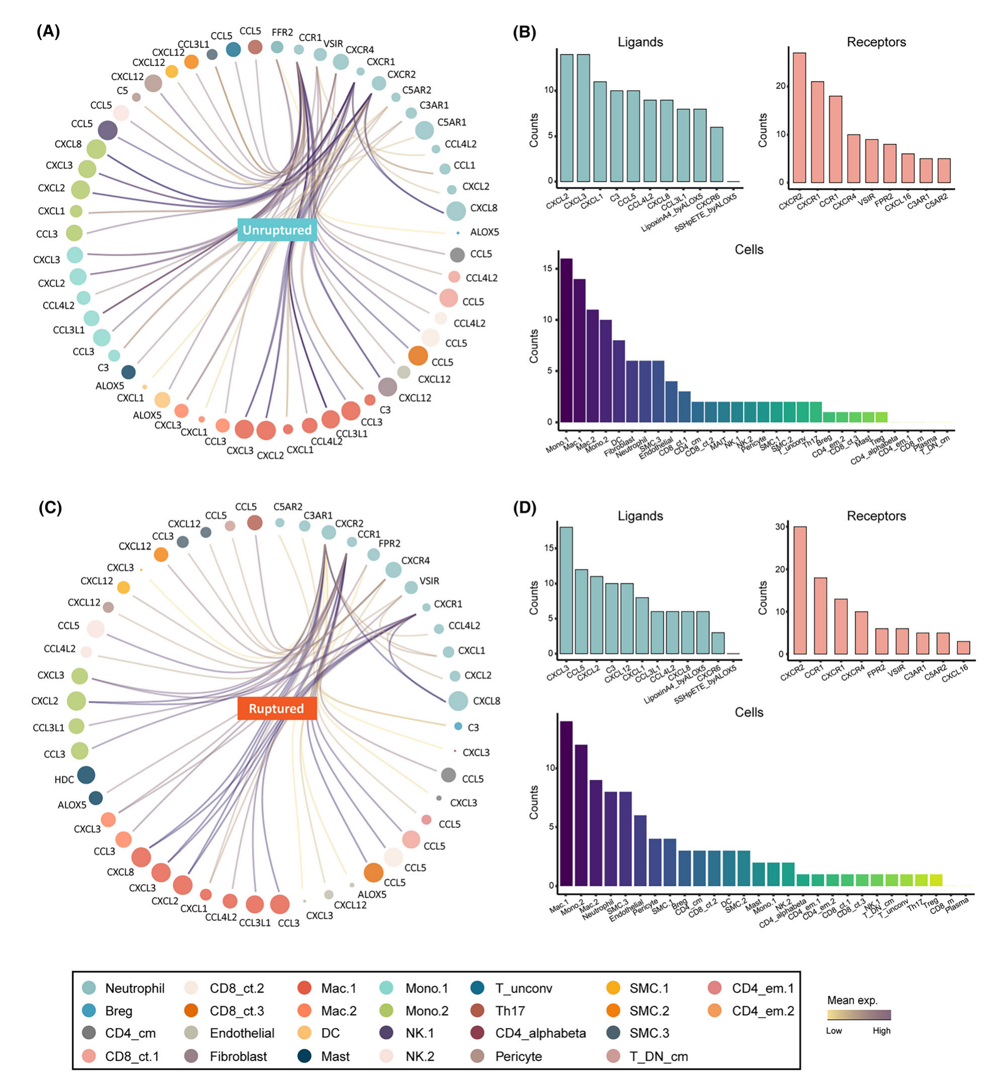 在之前的研究中忽略了中性粒細(xì)胞向 IA 組織的局部募集,為了填補(bǔ)這一空白,使用 cellphoneDB 算法進(jìn)行了細(xì)胞間通信分析。該研究首先表征了未破裂 IA 組織中參與中性粒細(xì)胞募集的細(xì)胞和細(xì)胞因子。結(jié)果顯示血管細(xì)胞(內(nèi)皮細(xì)胞、SMC 和周細(xì)胞)和免疫細(xì)胞(單核/巨噬/DC、中性粒細(xì)胞、T/B 淋巴細(xì)胞和肥大細(xì)胞)廣泛產(chǎn)生中性粒細(xì)胞趨化因子(圖4A)。高頻趨化因子包括 CXCL2/3/1,它與 CXCR2/1 和 CCR1 等中性粒細(xì)胞受體結(jié)合(圖 4B)。在未破裂的 IA 中,主要參與中性粒細(xì)胞募集的細(xì)胞是單核細(xì)胞/巨噬細(xì)胞,包括 Mono.1/2 和 Macro.1/2。在破裂的 IA 中招募中性粒細(xì)胞的趨化因子與未破裂的 IA 中的趨化因子表現(xiàn)出相似的模式組成,但對(duì) CXCL3 和 CCL5 的依賴性更高(圖 4C,D)。接收這些信號(hào)的中性粒細(xì)胞受體是保守的(圖4D)。