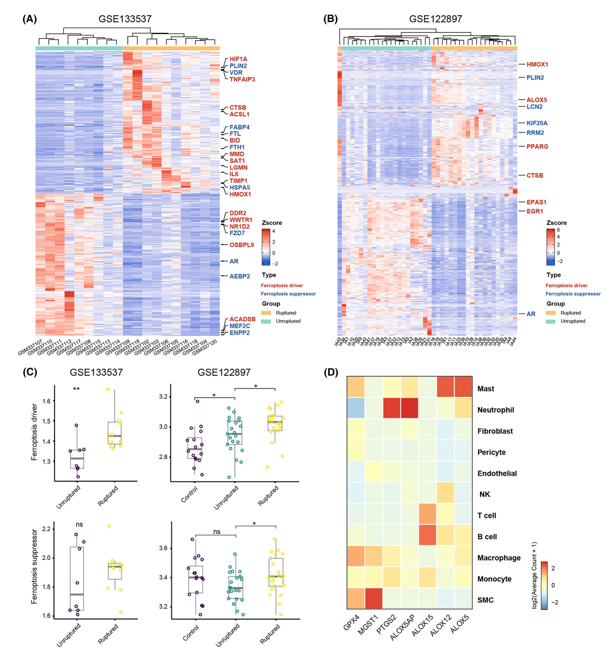 中性粒細(xì)胞介導(dǎo)的炎癥對(duì) IA 壁具有破壞性。最近,新出現(xiàn)的證據(jù)表明,中性粒細(xì)胞在某些情況下對(duì)鐵死亡敏感,這將進(jìn)一步促進(jìn)局部炎癥級(jí)聯(lián)反應(yīng)并促進(jìn) IA 進(jìn)展。在此,該研究描述了 IA 中中性粒細(xì)胞與鐵死亡之間的潛在關(guān)聯(lián)。該研究根據(jù)兩個(gè)批量轉(zhuǎn)錄組數(shù)據(jù)集計(jì)算了 DEG,并注釋了鐵死亡驅(qū)動(dòng)基因和抑制基因(圖 6A,B)。結(jié)果顯示在破裂的 IA 組織中,幾個(gè)鐵死亡驅(qū)動(dòng)基因和抑制基因有顯著差異,表明鐵死亡途徑失調(diào)。破裂的 IA 組織的鐵死亡驅(qū)動(dòng)基因 ssGSEA 評(píng)分高于未破裂組織,而抑制基因的 ssGSEA 評(píng)分相當(dāng)(圖6C),表明鐵死亡與 IA 破裂之間存在關(guān)聯(lián)。值得注意的是,未破裂的 IA 組織的鐵死亡驅(qū)動(dòng)基因得分高于對(duì)照樣本,表明鐵死亡也可能參與 IA 的形成。多個(gè)基因與中性粒細(xì)胞鐵死亡有關(guān),例如谷胱甘肽過(guò)氧化物酶 4(GPX4) 和微粒體谷胱甘肽 S 轉(zhuǎn)移酶 1 (MGST1) 充當(dāng)鐵死亡抑制劑;花生四烯酸脂氧合酶 5(ALOX5)、花生四烯酸脂氧合酶 5 激活蛋白(ALOX5AP)、花生四烯酸脂氧合酶 12(ALOX12)、花生四烯酸脂氧合酶 15(ALOX15) 和前列腺素 2(PTGS2) 充當(dāng)鐵死亡驅(qū)動(dòng)程序。在單細(xì)胞分辨率下,中性粒細(xì)胞高表達(dá)PTGS2和ALOX5AP(圖6D),它們與鐵死亡顯著相關(guān),表明這些細(xì)胞參與前列腺素和白三烯的產(chǎn)生,并且對(duì)鐵死亡敏感。盡管數(shù)量較少,但肥大細(xì)胞高度表達(dá) ALOX5 和 ALOX12。鑒于白三烯可以通過(guò)多細(xì)胞協(xié)同方式產(chǎn)生,局部白三烯可能是由中性粒細(xì)胞和肥大細(xì)胞以協(xié)同方式產(chǎn)生的??傊?,這些結(jié)果表明 IA 組織中中性粒細(xì)胞的鐵死亡可能是由 ALOX5AP 和 PTGS2 驅(qū)動(dòng)的,并且可以由肥大細(xì)胞促進(jìn)。