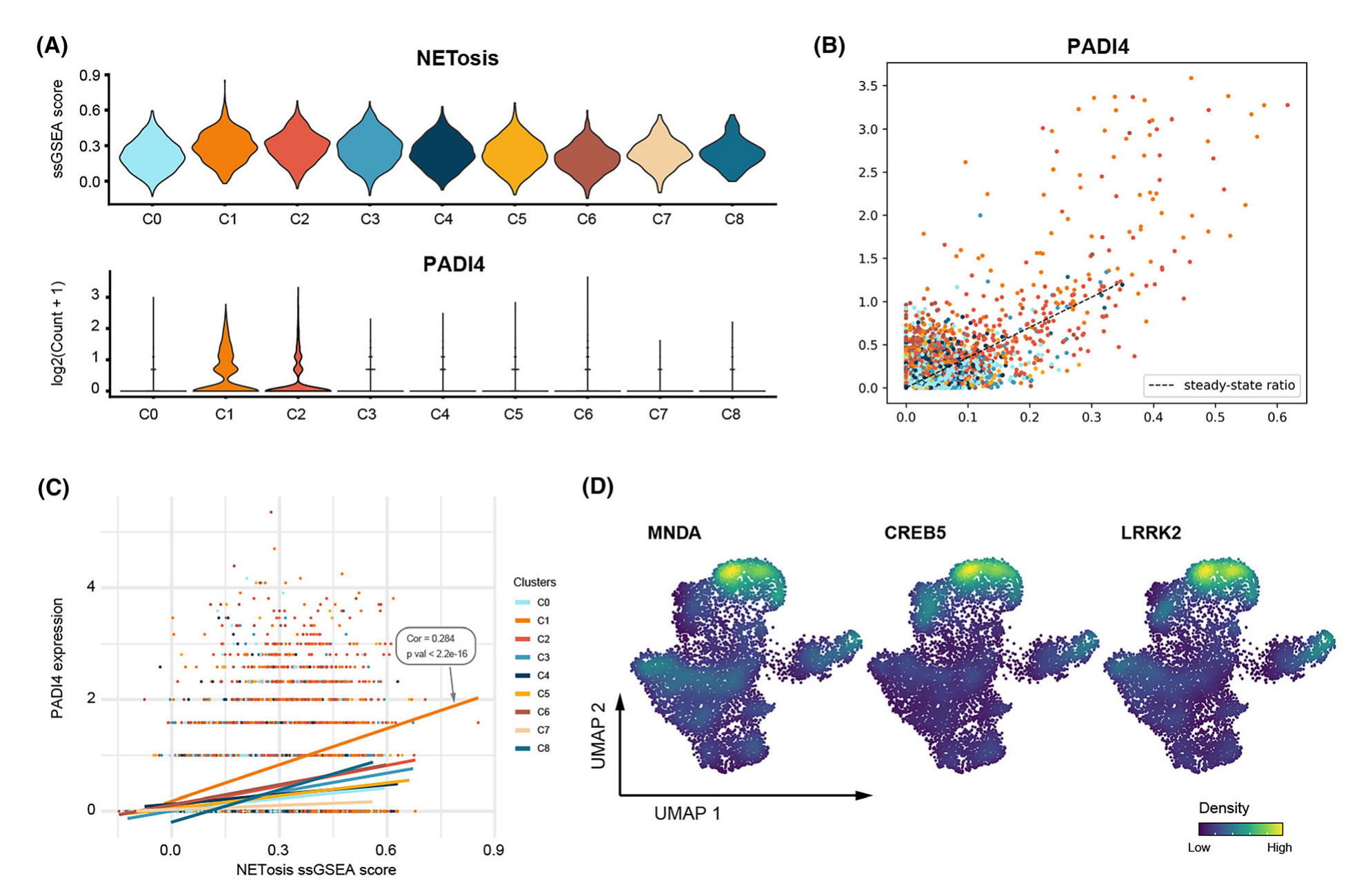 NET 的產(chǎn)生是中性粒細(xì)胞導(dǎo)致 IA 破裂的另一種方式,且取決于稱為 NETosis 的過(guò)程。因此,抑制 NETosis 是 IA 有前景的治療靶點(diǎn)。然而,由于這些細(xì)胞的多功能性,發(fā)生 NETosis 的中性粒細(xì)胞亞群尚不清楚。作者的結(jié)果表明 NETs 形成信號(hào)通路在 C1 中富集(圖2B)。該研究從京都基因和基因組百科全書 (KEGG) 數(shù)據(jù)庫(kù)中收集了人類 NETosis 基因特征,發(fā)現(xiàn) NETosis 的 ssGSEA 評(píng)分在 C1 中升高(圖7A)。PADI4?的表達(dá)對(duì)于組蛋白瓜氨酸化至關(guān)重要,在 C1 中上調(diào),并表現(xiàn)出正相關(guān)的未剪接/剪接 mRNA 比率(圖 7B),表明PADI4在驅(qū)動(dòng)C1 NETosis中發(fā)揮作用。此外,PADI4的表達(dá)與C1中NETosis的ssGSEA評(píng)分成正比(圖7C),證實(shí)C1易于發(fā)生NETosis。與其他中性粒細(xì)胞相比該中性粒細(xì)胞子集專門表達(dá)?MNDA?(Pct.1?=?91.8%, Pct.2?=?54.5%),?CREB5?(Pct.1?=?74.7%, Pct.2?= 33.7%) 和?LRKK2?(Pct.1?=?78.4%, Pct.2?=?36.2%) ?(圖7D),因此可以作為抑制 NETs 介導(dǎo)的 IA 進(jìn)展的目標(biāo)。