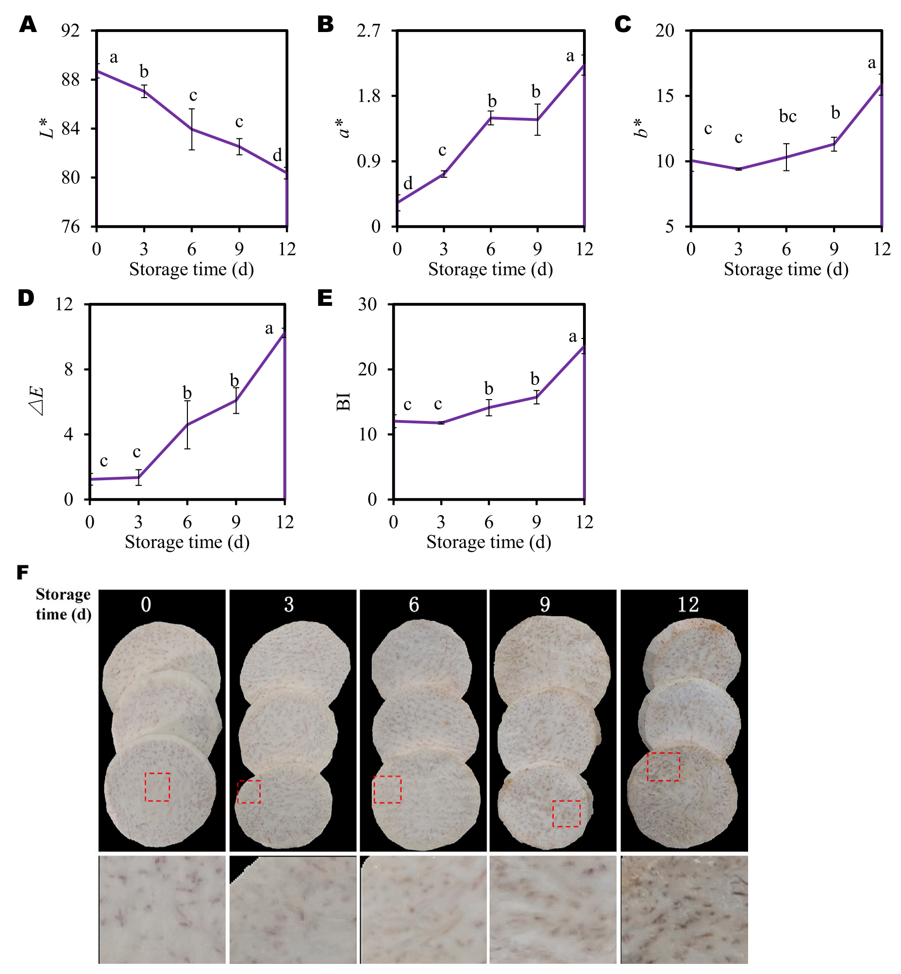 芋片切面顏色隨貯藏時(shí)間的變化如圖1A所示。切面L*值從0 d時(shí)的88.72下降到12 d時(shí)的80.36,冷藏12 d后L*值下降了9%(圖1A)。芋頭切片表面的a*、b*、△E和BI值在冷藏過(guò)程中也表現(xiàn)出類似的變化趨勢(shì)(圖1B-E)。這些褐變指標(biāo)隨著貯藏時(shí)間的延長(zhǎng)而增加。冷藏12 d后,a*、b*、△E和BI值分別比0 d增加了582%、58%、725%和19%(圖1B-E)。宏觀褐變癥狀在第6天首次出現(xiàn),并在隨后的儲(chǔ)存過(guò)程中逐漸加劇(圖1F)。綜上所述,這些結(jié)果表明,即使在低溫(4℃)條件下,切片芋頭在儲(chǔ)存過(guò)程中也會(huì)發(fā)生褐變。