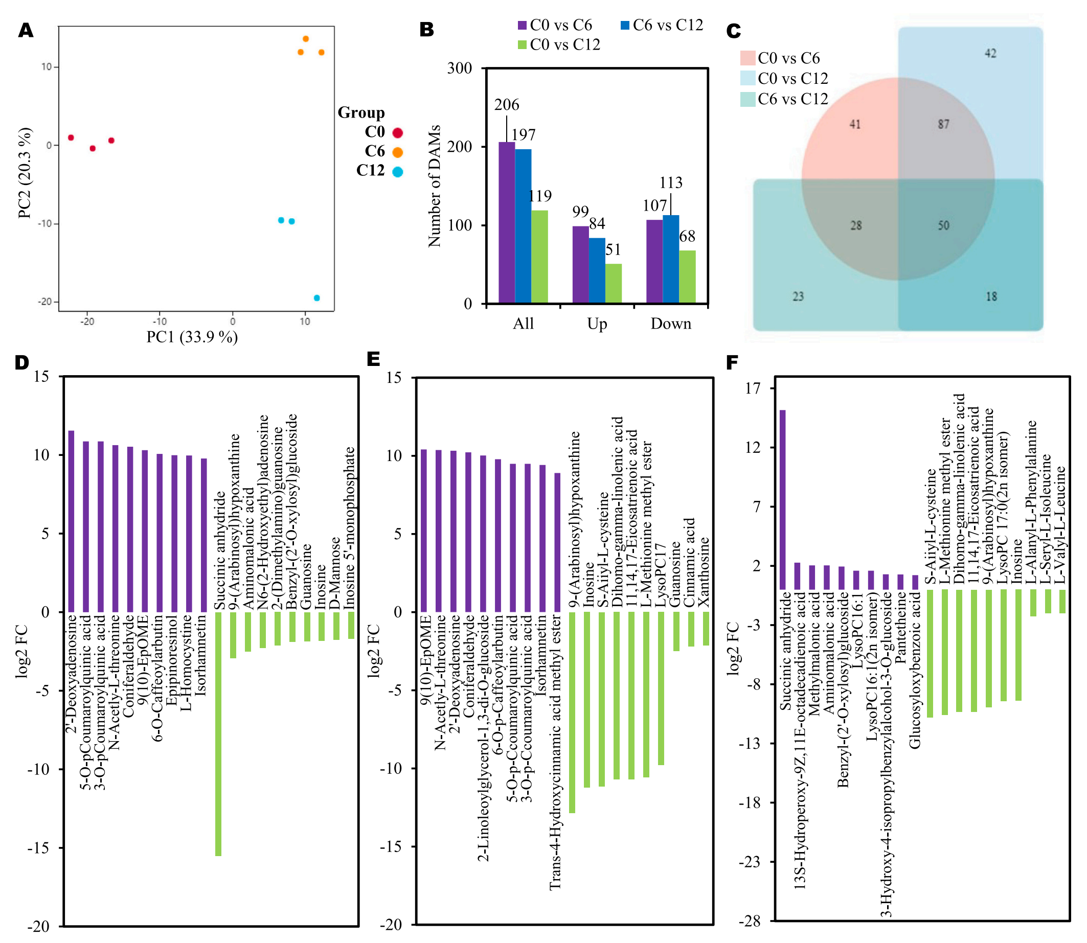 在C0和C12中,9(10)- epOME、n -乙酰- L-蘇氨酸、2 ‘ -脫氧腺苷、5- O -對(duì)香豆酰基奎寧酸、2-亞麻油基甘油-1,3-二- O -糖苷、松木醛、6- O -對(duì)咖啡?;芄啊愂罄钏?、3-O-對(duì)香豆?;鼘幩岷头词?4-羥基肉桂酸甲酯在C12組中含量較高。相反,9-(阿拉伯糖基)次黃嘌呤、肌苷、S – aiiyl -L -半胱氨酸、8,11,14-二十烷三烯酸甲酯、L-蛋氨酸甲酯、LysoPC17:0、鳥(niǎo)苷、肉桂酸、11、14、17-二十碳三烯酸和黃嘌呤在C0組中表現(xiàn)出更高的豐度(圖2F)。