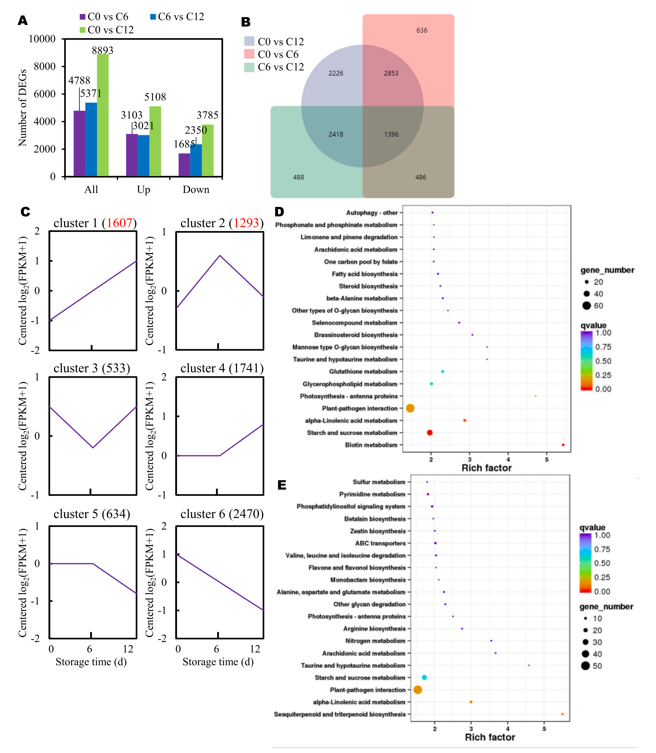 為了更好地了解基因表達(dá)的變化,該研究進(jìn)行比較轉(zhuǎn)錄組分析。結(jié)果顯示許多基因在芋褐變過(guò)程中表現(xiàn)出不同的表達(dá)譜。具體來(lái)說(shuō),在C0和C6的比較中,鑒定出3103個(gè)表達(dá)上調(diào)的基因和1685個(gè)表達(dá)下調(diào)的基因。同樣,在C6和C12組的比較中,發(fā)現(xiàn)3021個(gè)DEGs上調(diào),2350個(gè)DEGs下調(diào)。此外,與C0組相比,C12組有5108個(gè)基因的表達(dá)量更高(圖4A)。在褐變過(guò)程中發(fā)現(xiàn)了更多的上調(diào)基因,表明芋頭的基因表達(dá)發(fā)生顯著的變化。有趣的是,當(dāng)比較C0與C6、C6與C12、C0與C12之間的DEGs時(shí),發(fā)現(xiàn)1396個(gè)DEGs重疊(圖4B)。