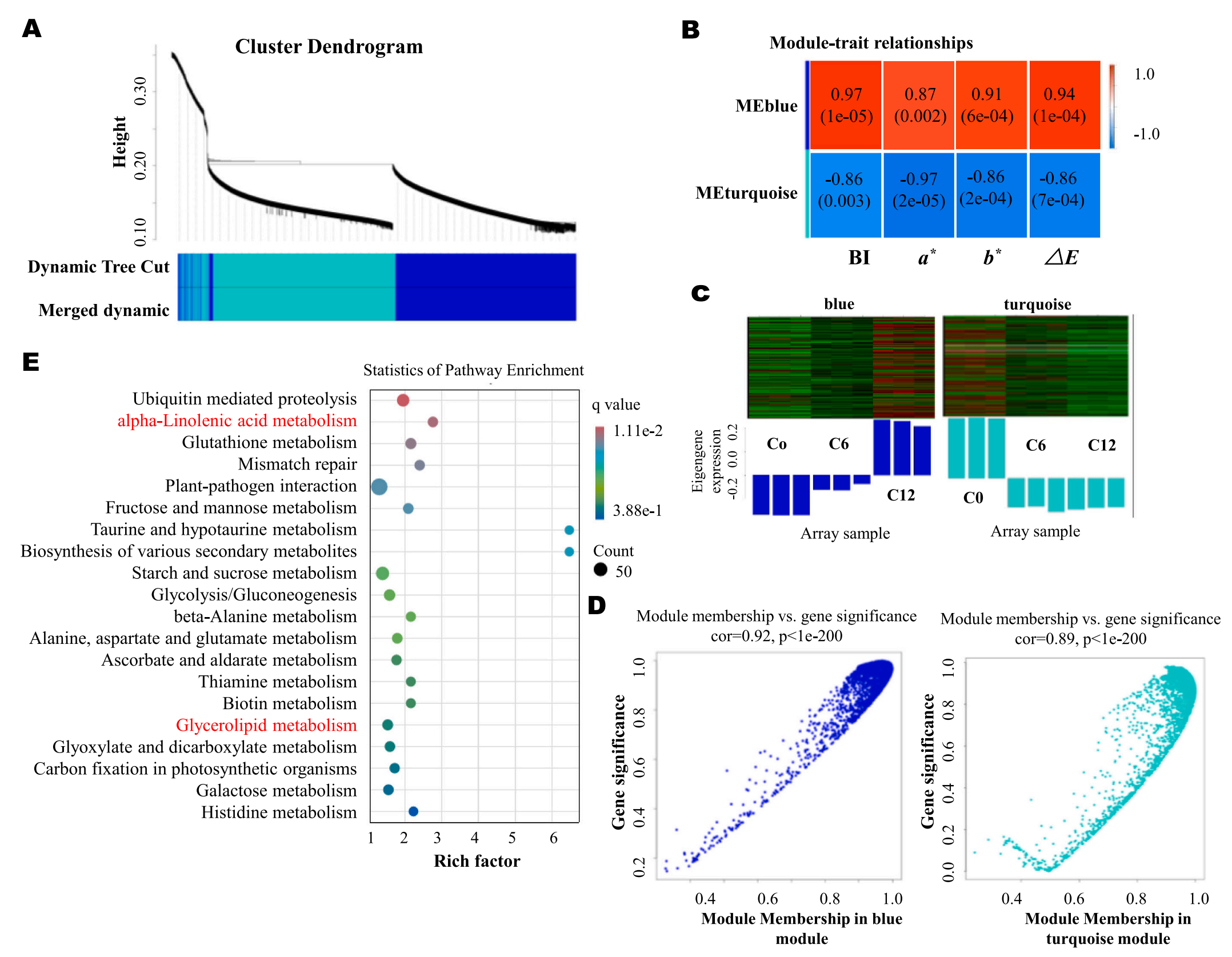 為了進(jìn)一步研究脂質(zhì)代謝與冷藏芋頭切片褐變之間的關(guān)系,研究采用WGCNA分析進(jìn)行研究。如圖5A所示,鑒定出兩個(gè)與切片芋頭在冷藏期間褐變發(fā)育顯著相關(guān)的模塊。藍(lán)色模塊中基因與褐變BI、a*、b*、△E 4項(xiàng)指標(biāo)呈正相關(guān),而綠松石模塊中基因與褐變指標(biāo)呈負(fù)相關(guān)(圖5B)。此外,隨著褐變的發(fā)展,藍(lán)色模塊中基因的表達(dá)量逐漸增加,而綠松石模塊中基因的表達(dá)量逐漸減少(圖5C)。此外,藍(lán)色和綠松石模塊中每個(gè)基因與褐變的相關(guān)性都很高(圖5D),說(shuō)明這兩個(gè)模塊的基因與冷藏芋頭片的褐變發(fā)育高度相關(guān)。