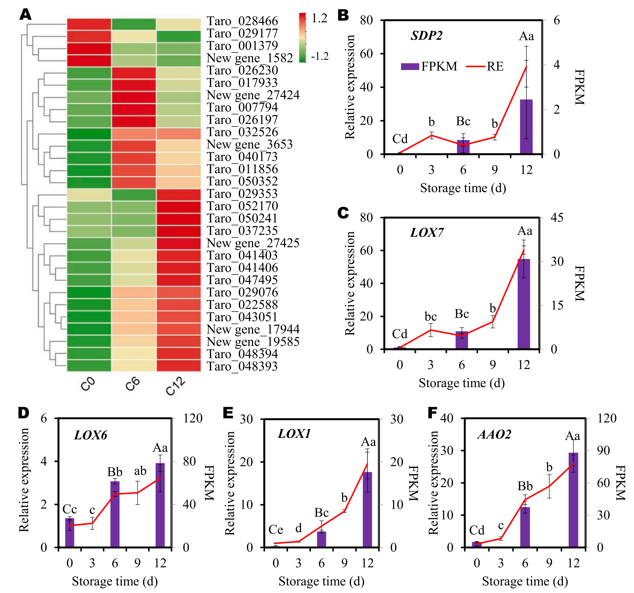 為了驗(yàn)證RNA-seq數(shù)據(jù)的質(zhì)量,研究檢測(cè)了亞麻酸代謝途徑中DEGs的表達(dá)模式。在切片芋頭褐變過(guò)程中,該途徑中的DEGs差異表達(dá)(圖6A)。在這些基因中,4個(gè)基因(taro_028466、029177、001379new gene_1582)的表達(dá)量在第6天較0天下降(圖6A)。10個(gè)基因(taro_026230、017933、007794、026197、032526、040173、011856、050352以及new gene_274243563)的表達(dá)量在第6天出現(xiàn)了增加,隨后又出現(xiàn)了下降。然而,這些基因在第12天的表達(dá)水平仍然高于第0天(圖6A)。其余15個(gè)基因在褐變過(guò)程中表現(xiàn)出穩(wěn)定的表達(dá)增加。這些結(jié)果再次證實(shí)了亞麻酸代謝參與了芋頭褐變過(guò)程。