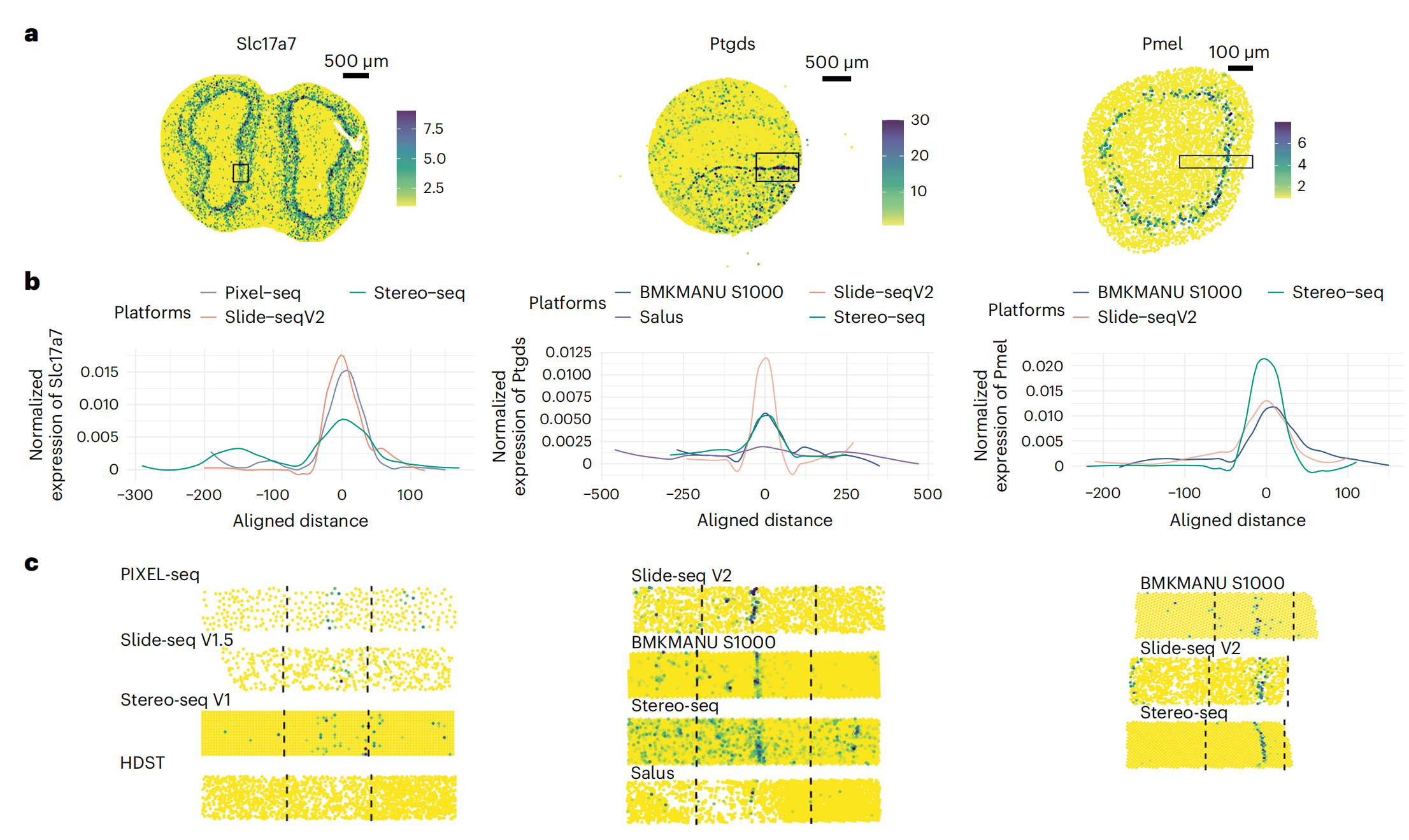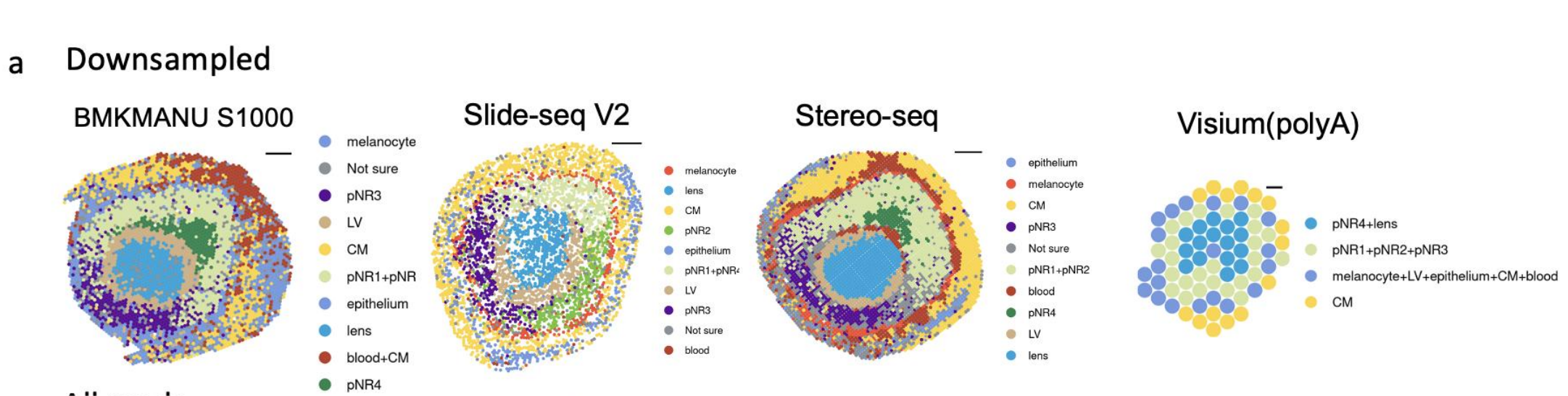使用11種sST技術(shù),對(duì)三種組織進(jìn)行實(shí)驗(yàn),測(cè)序及分析,并對(duì)可以實(shí)現(xiàn)更高分辨率的BMKMANU S1000、Stereo-seqSlide-seqV2?在細(xì)胞級(jí)(10μm)分辨率下進(jìn)一步進(jìn)行了分析。