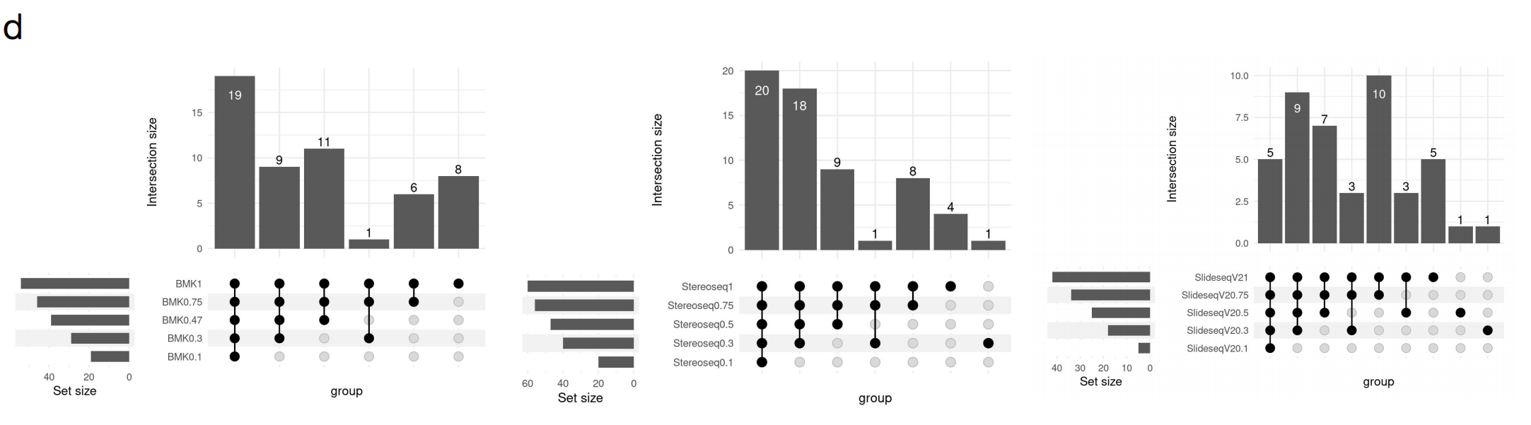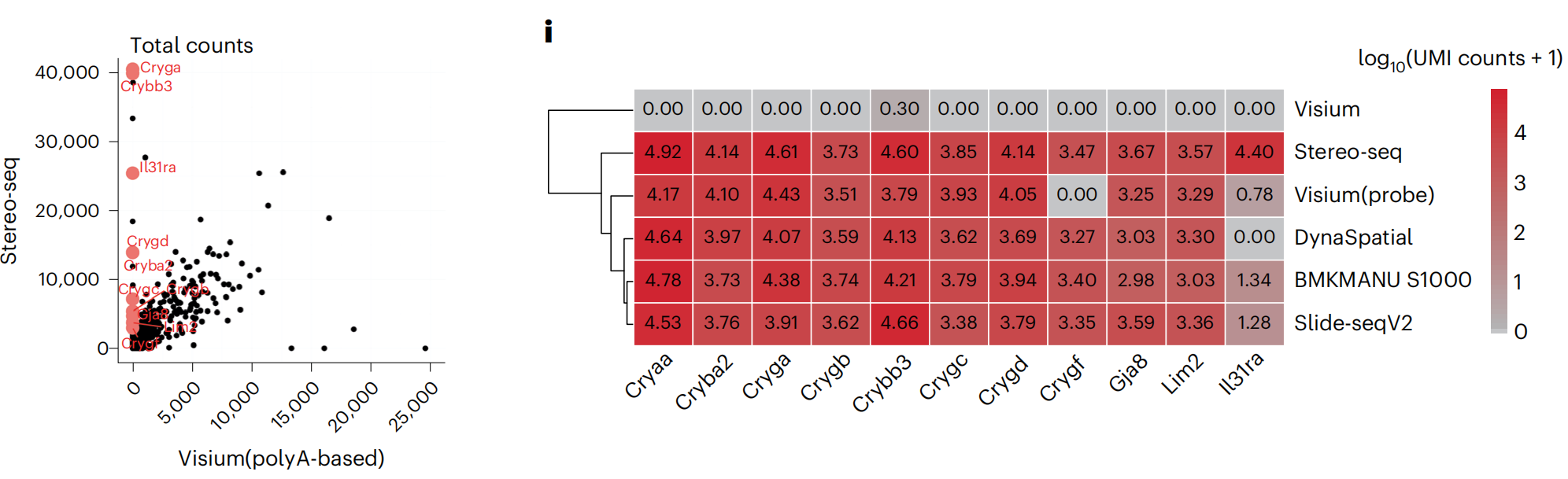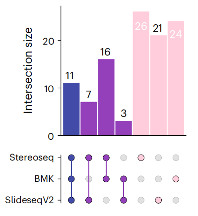文中對(duì)visium(polyA-based)未能捕獲到的基因,在其它技術(shù)平臺(tái)中的表現(xiàn)也做了統(tǒng)計(jì),其中BMKMANU S1000、Stereo-seqSlide-seqV2都展現(xiàn)出了統(tǒng)一且全面的基因捕獲性能。